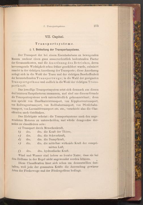 Das jeweilige Transportssystem setzt sich demnach aus diesen drei letzteren Hauptfactoren zusammen, und sind aus diesem Grunde die Transportssysteme noch unterschiedlich gekennzeichnet; denn man spricht von Handkarrentransport, von Kippkarrentransport, von Rollwagentransport, von Rollbahntransport, von Pferdebahntransport, von Locomitivtransport etc. etc., verschiebt also die Classification nach Gutdünken.