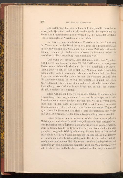 Diese Fortschritte des Erdbaues, welche einer unserer grössten Meister, der verstorbene Baurath Henz, wissenschaftlich inaugurirt hat, sind frühzeitig schon in Deutschland gewürdiget und gepflegt worden, weil in diesem Lande die Erdarbeiten bei den Eisenbahnbauten eine ganz hervorragende Wichtigkeit erlangt haben; denn in Deutschland entstanden die alten Stammbahnen auf flacher Ebene und mussten in Consequenz der Leistungsfähigkeit die fortsetzenden und abzweigenden und namentlich die concurrirenden Gebirgsbahnen mit möglichst grossen Radien und möglichst geringen Steigungen, also mit sehr bedeutenden Erdarbeiten erbaut werden, um, wenn auch mit