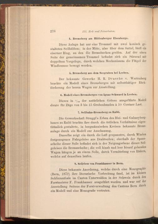 Der bekannte Gewerke H. R. Drasche v. Wartenberg brachte ein Modell eines Bremsberges mit selbstthätiger Rückförderung der leeren Wagen zur Ausstellung.