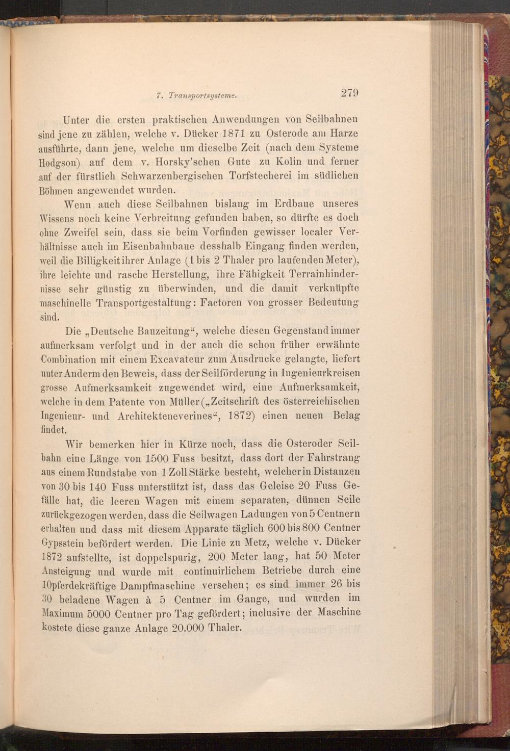 Wir bemerken hier in Kürze noch, dass die Osteroder Seilbahn eine Länge von 1500 Fuss besitzt, dass dort der Fahrstrang aus einem Rundstabe von 1 Zoll Stärke besteht, welcher in Distanzen von 30 bis 140 Fuss unterstützt ist, dass das Geleise 20 Fuss Gefälle hat, die leeren Wagen mit einem separaten, dünnen Seile zurückgezogen werden, dass die Seilwagen Ladungen von 5 Centnern erhalten und dass mit diesem Apparate täglich 600 bis 800 Centner Gypsstein befördert werden. Die Linie zu Metz, welche v. Dücker 1872 aufstellte, ist doppelspurig, 200 Meter lang, hat 50 Meter Ansteigung und wurde mit continuirlichem Betriebe durch eine 10pferdekräftige Dampfmaschine versehen; es sind immer 26 bis 30 beladene Wagen à 5 Centner im Gange, und wurden im Maximum 5000 Centner pro Tag gefördert; inclusive der Maschine kostete diese ganze Anlage 20.000 Thaler.