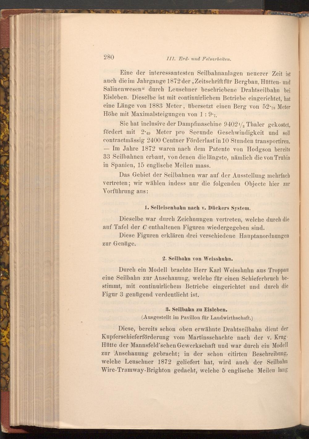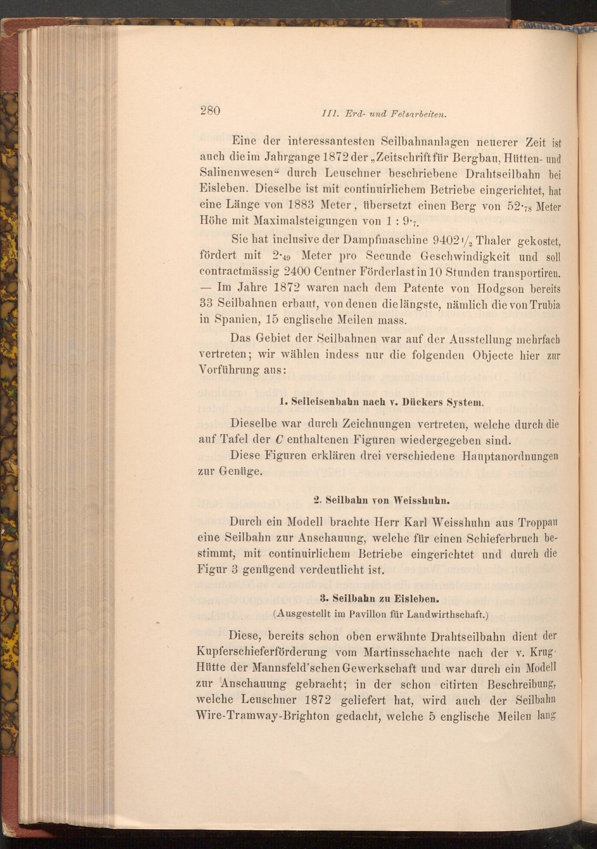 Eine der interessantesten Seilbahnanlagen neuerer Zeit ist auch die im Jahrgange 1872 der Zeitschrift für Bergbau, Hütten- und Salinenwesen" durch Leuschner beschriebene Drahtseilbahn bei Eisleben. Dieselbe ist mit continuirlichem Betriebe eingerichtet, hat eine Länge von 1883 Meter, übersetzt einen Berg von 52 78 Meter Höhe mit Maximalsteigungen von 1: 9.7.