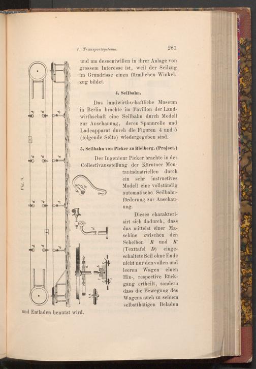 Das landwirthschaftliche Museum in Berlin brachte im Pavillon der Landwirthschaft eine Seilbahn durch Modell zur Anschauung, deren Spannrolle und Ladeapparat durch die Figuren 4 und 5 ( folgende Seite) wiedergegeben sind.