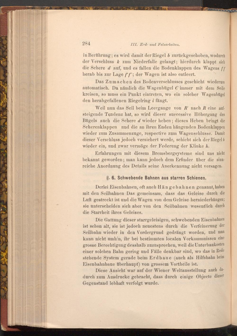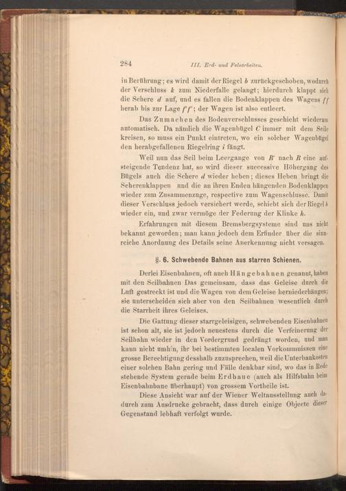 Die Gattung dieser starrgeleisigen, schwebenden Eisenbahnen ist schon alt, sie ist jedoch neuestens durch die Verfeinerung der Seilbahn wieder in den Vordergrund gedrängt worden, und man kann nicht umhin, ihr bei bestimmten localen Vorkommnissen eine grosse Berechtigung desshalb zuzusprechen, weil die Unterbaukosten einer solchen Bahn gering und Fälle denkbar sind, wo das in Rede stehende System gerade beim Erdbaue( auch als Hilfsbahn beim Eisenbahnbaue überhaupt) von grossem Vortheile ist.