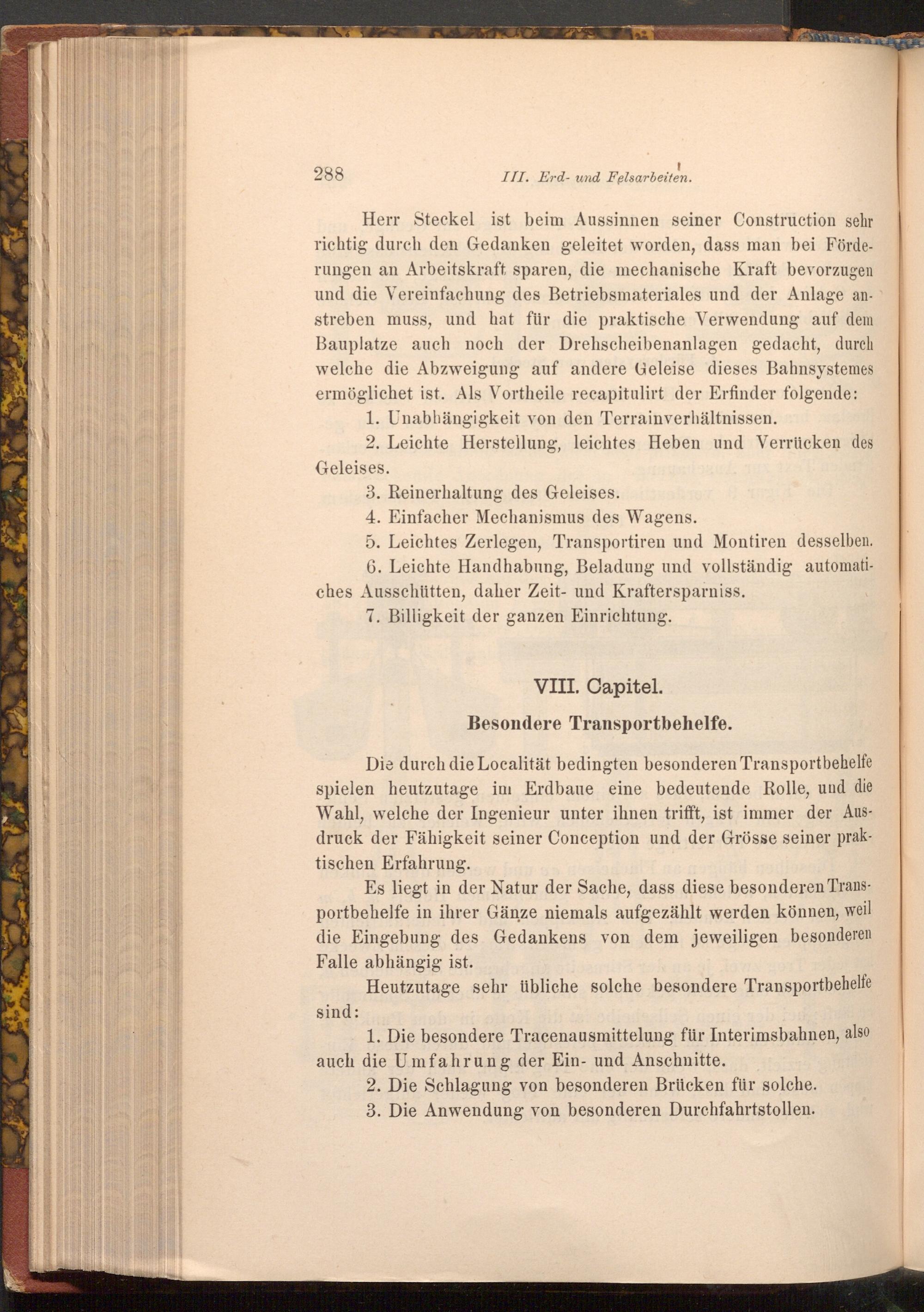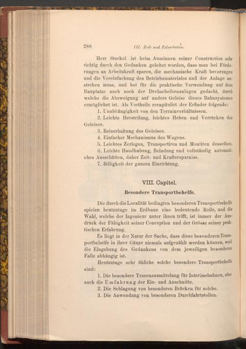 Die durch die Localität bedingten besonderen Transportbehelfe spielen heutzutage in Erdbaue eine bedeutende Rolle, und die Wahl, welche der Ingenieur unter ihnen trifft, ist immer der Ausdruck der Fähigkeit seiner Conception und der Grösse seiner praktischen Erfahrung.