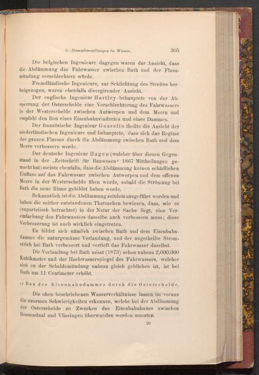 Der deutsche Ingenieur Hagen( welcher über diesen Gegenstand in der Zeitschrift für Bauwesen" 1867 Mittheilungen gemacht hat) meinte ebenfalls, dass die Abdämmung keinen schädlichen Einfluss auf das Fahrwasser zwischen Antwerpen und dem offenen Meere in der Westerschelde üben werde, sobald die Strömung bei Bath die neue Rinne gebildet haben werde.