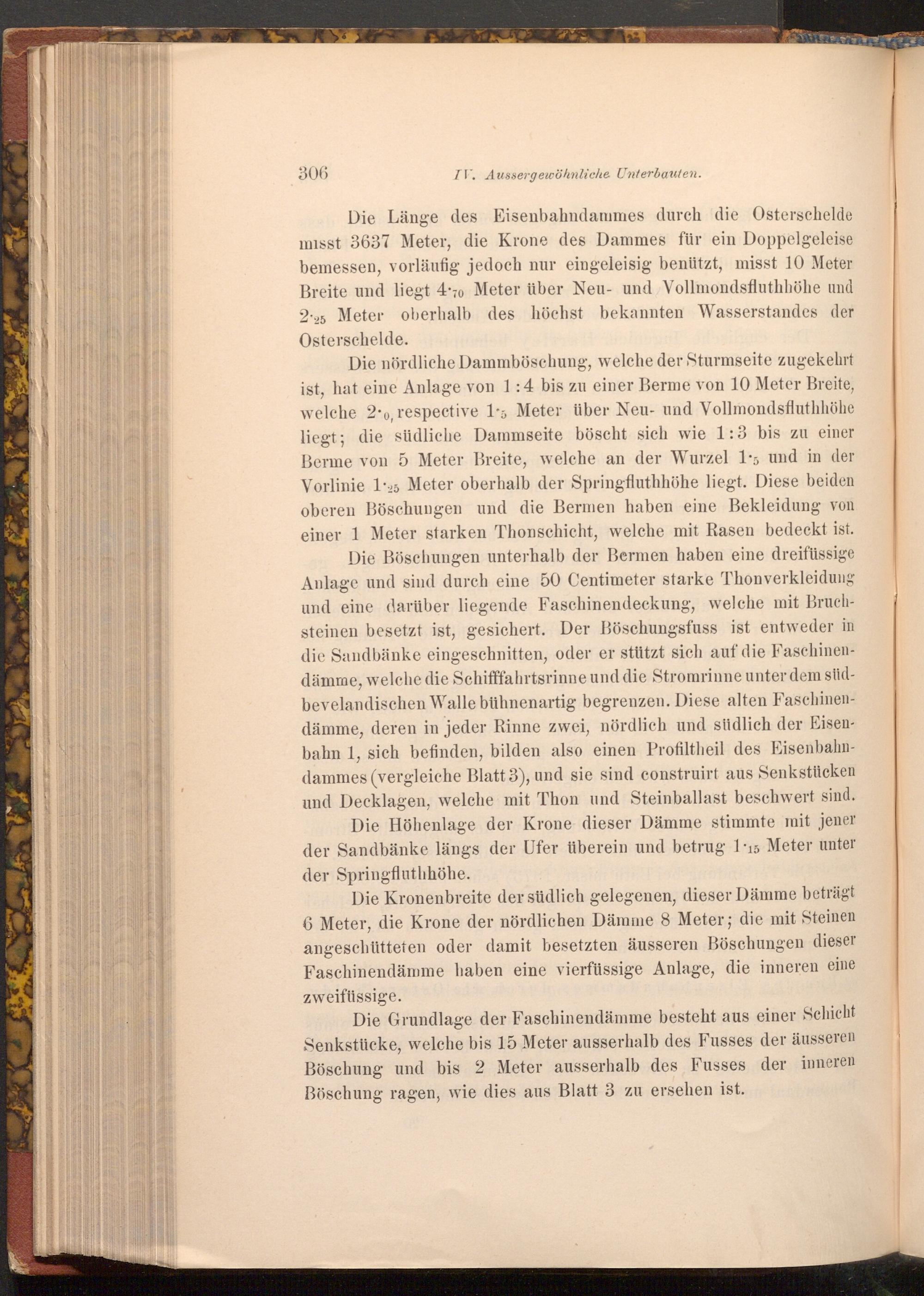 Die Länge des Eisenbahndammes durch die Osterschelde misst 3637 Meter, die Krone des Dammes für ein Doppelgeleise bemessen, vorläufig jedoch nur eingeleisig benützt, misst 10 Meter Breite und liegt 4.70 Meter über Neu- und Vollmondsfluthhöhe und 2.25 Meter oberhalb des höchst bekannten Wasserstandes der Osterschelde.