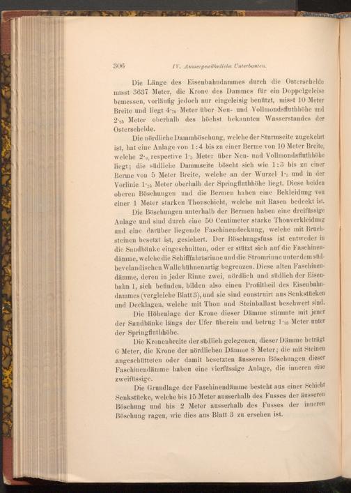 Die nördliche Dammböschung, welche der Sturmseite zugekehrt ist, hat eine Anlage von 1: 4 bis zu einer Berme von 10 Meter Breite, welche 2.0, respective 1 Meter über Neu- und Vollmondsfluthhöhe liegt; die südliche Dammseite böscht sich wie 1: 3 bis zu einer Berme von 5 Meter Breite, welche an der Wurzel 15 und in der Vorlinie 125 Meter oberhalb der Springfluthhöhe liegt. Diese beiden oberen Böschungen und die Bermen haben eine Bekleidung von einer 1 Meter starken Thonschicht, welche mit Rasen bedeckt ist. Die Böschungen unterhalb der Bermen haben eine dreifüssige Anlage und sind durch eine 50 Centimeter starke Thonverkleidung und eine darüber liegende Faschinendeckung, welche mit Bruchsteinen besetzt ist, gesichert. Der Böschungsfuss ist entweder in die Sandbänke eingeschnitten, oder er stützt sich auf die Faschinendämme, welche die Schifffahrtsrinne und die Stromrinne unter dem südbevelandischen Walle bühnenartig begrenzen. Diese alten Faschinendämme, deren in jeder Rinne zwei, nördlich und südlich der Eisenbahn 1, sich befinden, bilden also einen Profiltheil des Eisenbahndammes( vergleiche Blatt 3), und sie sind construirt aus Senkstücken und Decklagen, welche mit Thon und Steinballast beschwert sind. Die Höhenlage der Krone dieser Dämme stimmte mit jener der Sandbänke längs der Ufer überein und betrug 115 Meter unter der Springfluthhöhe.