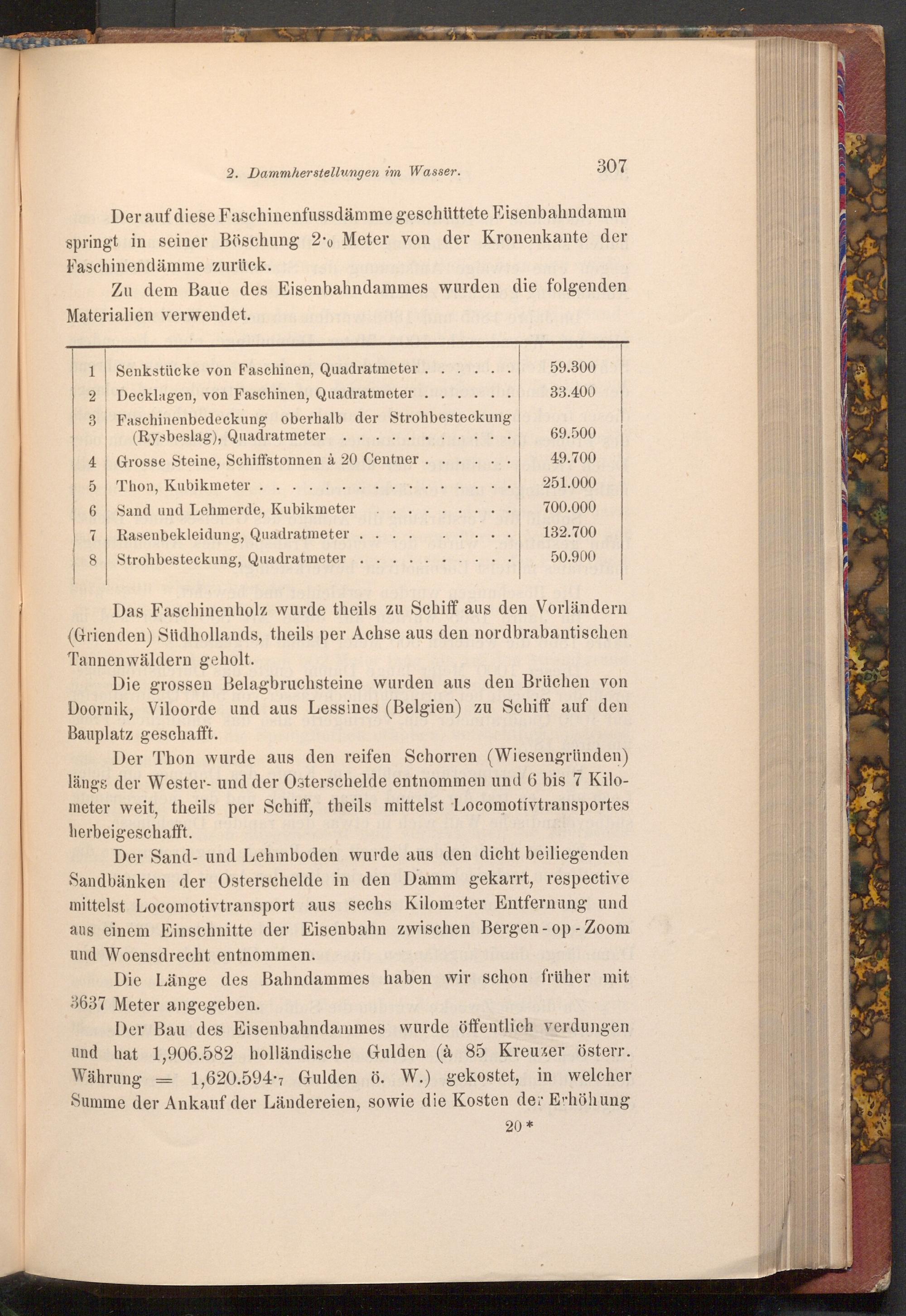 Der Sand- und Lehmboden wurde aus den dicht beiliegenden Sandbänken der Osterschelde in den Damm gekarrt, respective mittelst Locomotivtransport aus sechs Kilometer Entfernung und aus einem Einschnitte der Eisenbahn zwischen Bergen- op- Zoom und Woensdrecht entnommen.