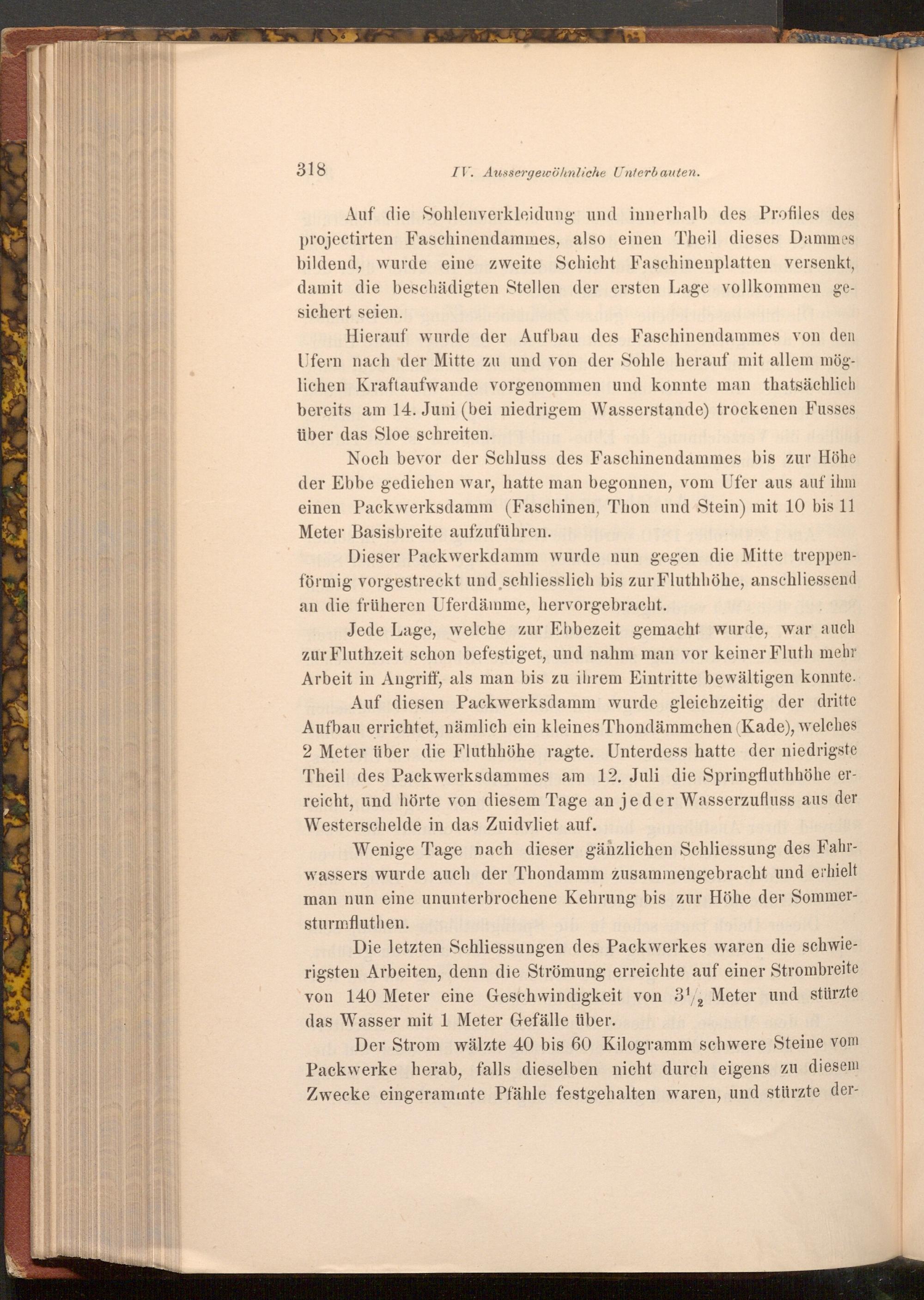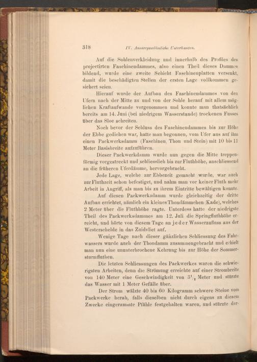 Hierauf wurde der Aufbau des Faschinendammes von den Ufern nach der Mitte zu und von der Sohle herauf mit allem möglichen Kraftaufwande vorgenommen und konnte man thatsächlich bereits am 14. Juni( bei niedrigem Wasserstande) trockenen Fusses über das Sloe schreiten.no