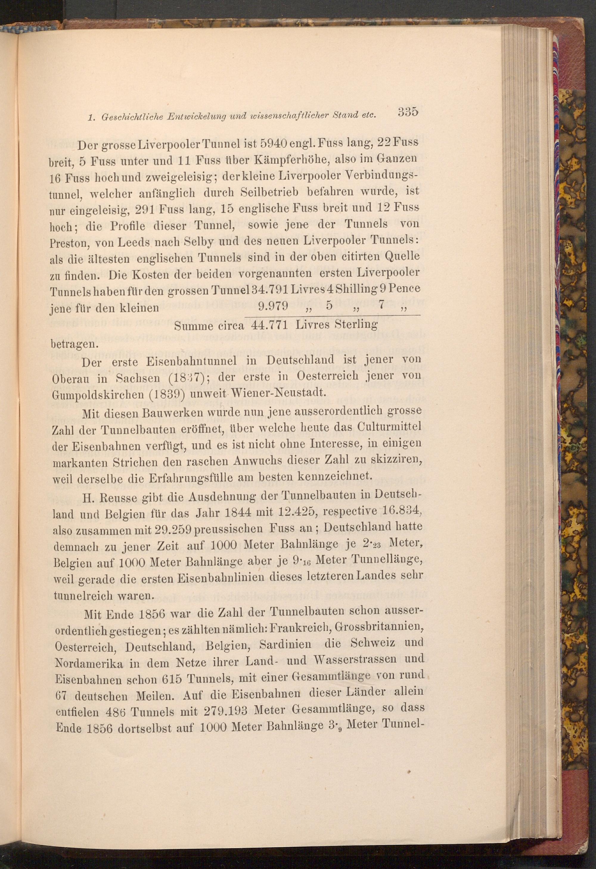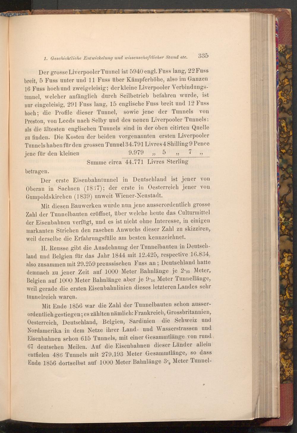 H. Reusse gibt die Ausdehnung der Tunnelbauten in Deutschland und Belgien für das Jahr 1844 mit 12.425, respective 16.834, also zusammen mit 29.259 preussischen Fuss an; Deutschland hatte demnach zu jener Zeit auf 1000 Meter Bahnlänge je 2.23 Meter, Belgien auf 1000 Meter Bahnlänge aber je 9.16 Meter Tunnellänge, weil gerade die ersten Eisenbahnlinien dieses letzteren Landes sehr tunnelreich waren.