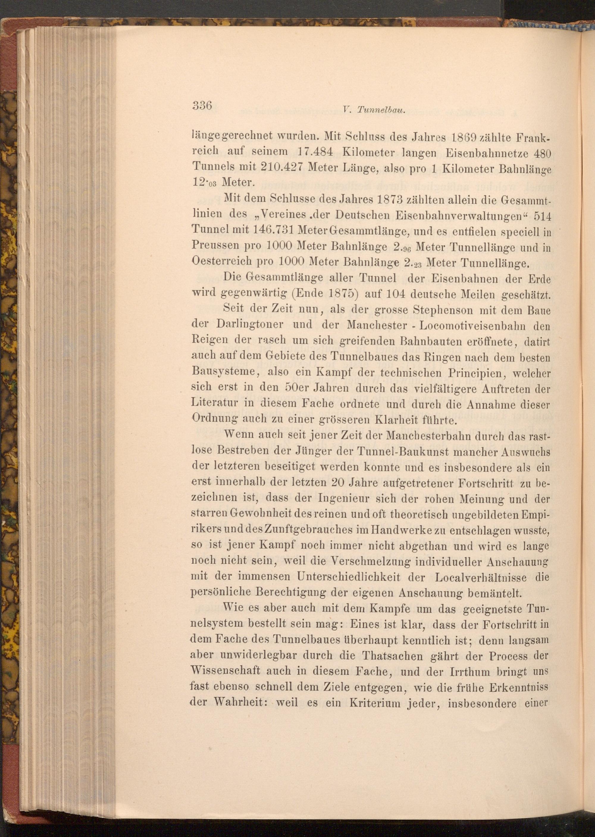 Die Gesammtlänge aller Tunnel der Eisenbahnen der Erde wird gegenwärtig( Ende 1875) auf 104 deutsche Meilen geschätzt. Seit der Zeit nun, als der grosse Stephenson mit dem Baue der Darlingtoner und der Manchester- Locomotiveisenbahn den Reigen der rasch um sich greifenden Bahnbauten eröffnete, datirt auch auf dem Gebiete des Tunnelbaues das Ringen nach dem besten Bausysteme, also ein Kampf der technischen Principien, welcher sich erst in den 50er Jahren durch das vielfältigere Auftreten der Literatur in diesem Fache ordnete und durch die Annahme dieser Ordnung auch zu einer grösseren Klarheit führte.