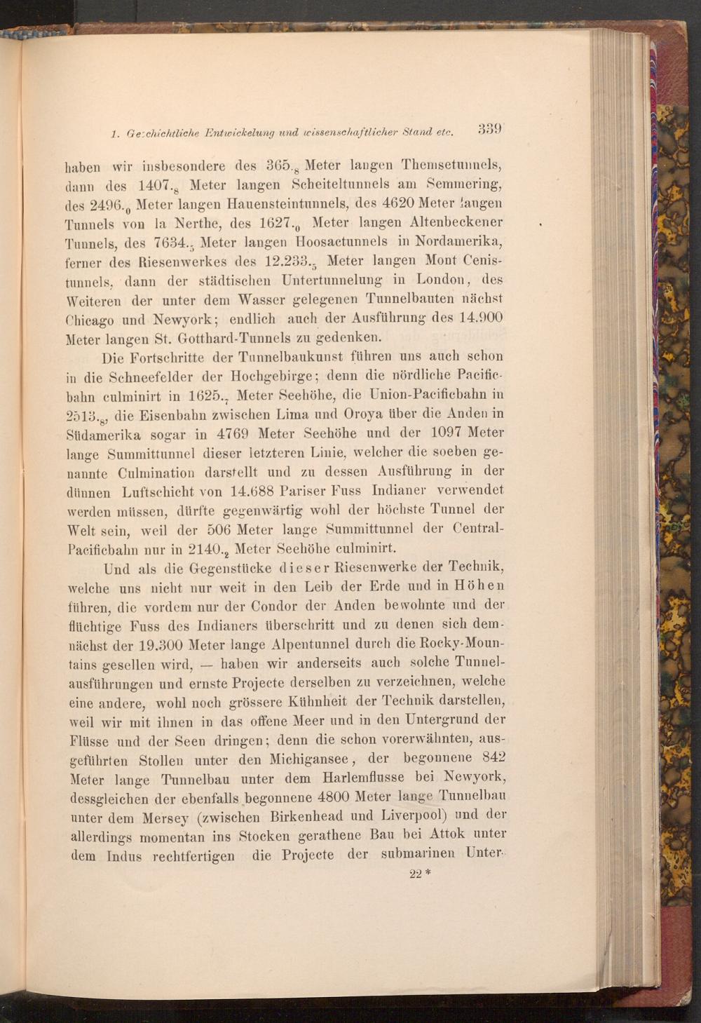 haben wir insbesondere des 365., Meter langen Themsetunnels, dann des 1407., Meter langen Scheiteltunnels am Semmering, des 2496., Meter langen Hauensteintunnels, des 4620 Meter langen Tunnels von la Nerthe, des 1627., Meter langen Altenbeckener Tunnels, des 7634., Meter langen Hoosactunnels in Nordamerika, ferner des Riesenwerkes des 12.233., Meter langen Mont Cenistunnels, dann der städtischen Untertunnelung in London, des Weiteren der unter dem Wasser gelegenen Tunnelbauten nächst Chicago und Newyork; endlich auch der Ausführung des 14.900 Meter langen St. Gotthard- Tunnels zu gedenken.