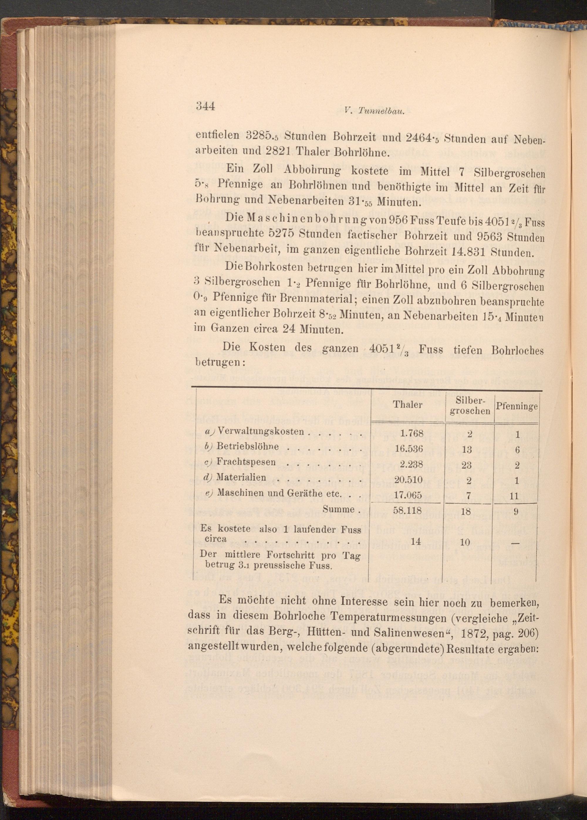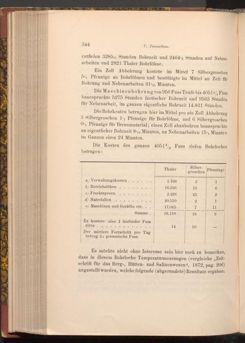 Ein Zoll Abbohrung kostete im Mittel 7 Silbergroschen 5., Pfennige an Bohrlöhnen und benöthigte im Mittel an Zeit für Bohrung und Nebenarbeiten 31.55 Minuten.