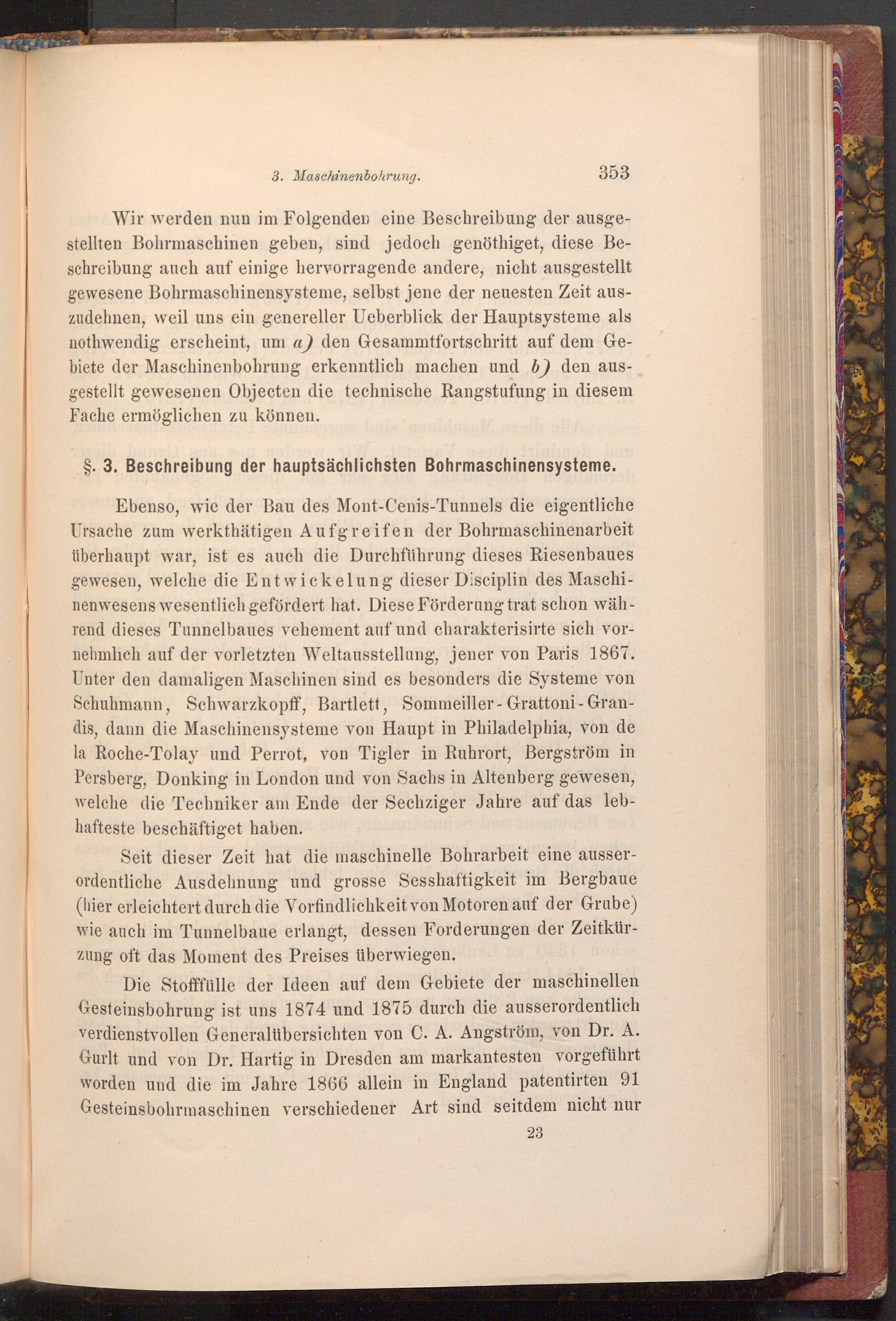 Ebenso, wie der Bau des Mont- Cenis- Tunnels die eigentliche Ursache zum werkthätigen Aufgreifen der Bohrmaschinenarbeit überhaupt war, ist es auch die Durchführung dieses Riesenbaues gewesen, welche die Entwickelung dieser Disciplin des Maschinenwesens wesentlich gefördert hat. Diese Förderung trat schon während dieses Tunnelbaues vehement auf und charakterisirte sich vornehmlich auf der vorletzten Weltausstellung, jener von Paris 1867. Unter den damaligen Maschinen sind es besonders die Systeme von Schuhmann, Schwarzkopff, Bartlett, Sommeiller- Grattoni- Grandis, dann die Maschinensysteme von Haupt in Philadelphia, von de la Roche- Tolay und Perrot, von Tigler in Ruhrort, Bergström in Persberg, Donking in London und von Sachs in Altenberg gewesen, welche die Techniker am Ende der Sechziger Jahre auf das lebhafteste beschäftiget haben.