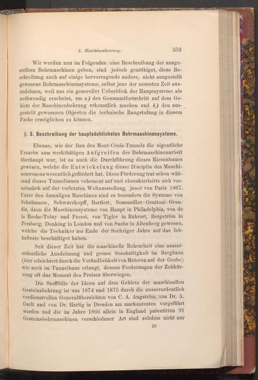 Seit dieser Zeit hat die maschinelle Bohrarbeit eine ausserordentliche Ausdehnung und grosse Sesshaftigkeit im Bergbaue ( hier erleichtert durch die Vorfindlichkeit von Motoren auf der Grube) wie auch im Tunnelbaue erlangt, dessen Forderungen der Zeitkürzung oft das Moment des Preises überwiegen. mx 0121 nois