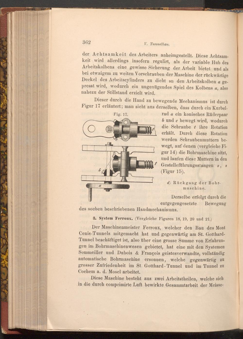 Der Maschinenmeister Ferroux, welcher den Bau des Mont Cenis- Tunnels mitgemacht hat und gegenwärtig am St. GotthardTunnel beschäftiget ist, also über eine grosse Summe von Erfahrungen im Bohrmaschinenwesen gebietet, hat eine mit den Systemen Sommeiller und Dubois& François geistesverwandte, vollständig automatische Bohrmaschine ersonnen, welche gegenwärtig zu grosser Zufriedenheit im St. Gotthard- Tunnel und im Tunnel zu Cochem a. d. Mosel arbeitet.