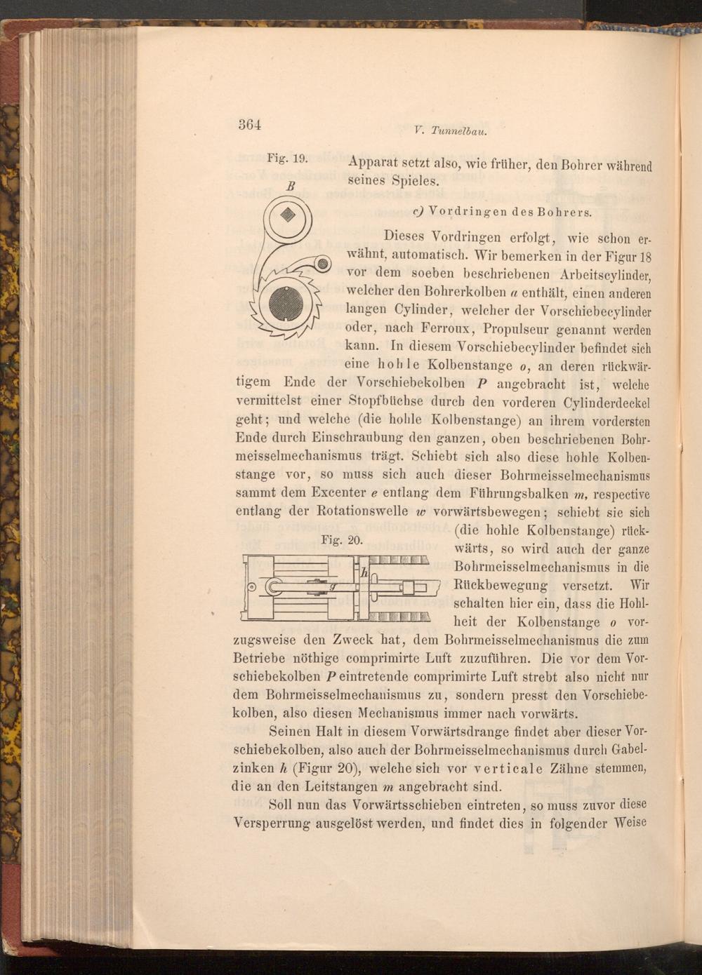 Dieses Vordringen erfolgt, wie schon erwähnt, automatisch. Wir bemerken in der Figur 18 vor dem soeben beschriebenen Arbeitscylinder, welcher den Bohrerkolben a enthält, einen anderen langen Cylinder, welcher der Vorschiebecylinder oder, nach Ferroux, Propulseur genannt werden kann. In diesem Vorschiebecylinder befindet sich eine hohle Kolbenstange o, an deren rückwärtigem Ende der Vorschiebekolben P angebracht ist, welche vermittelst einer Stopfbüchse durch den vorderen Cylinderdeckel geht; und welche( die hohle Kolbenstange) an ihrem vordersten Ende durch Einschraubung den ganzen, oben beschriebenen Bohrmeisselmechanismus trägt. Schiebt sich also diese hohle Kolbenstange vor, so muss sich auch dieser Bohrmeisselmechanismus sammt dem Excenter e entlang dem Führungsbalken m, respective entlang der Rotationswelle w vorwärtsbewegen; schiebt sie sich ( die hohle Kolbenstange) rückFig. 20. lov wärts, so wird auch der ganze Bohrmeisselmechanismus in die Rückbewegung versetzt. Wir schalten hier ein, dass die Hohlheit der Kolbenstange o vor