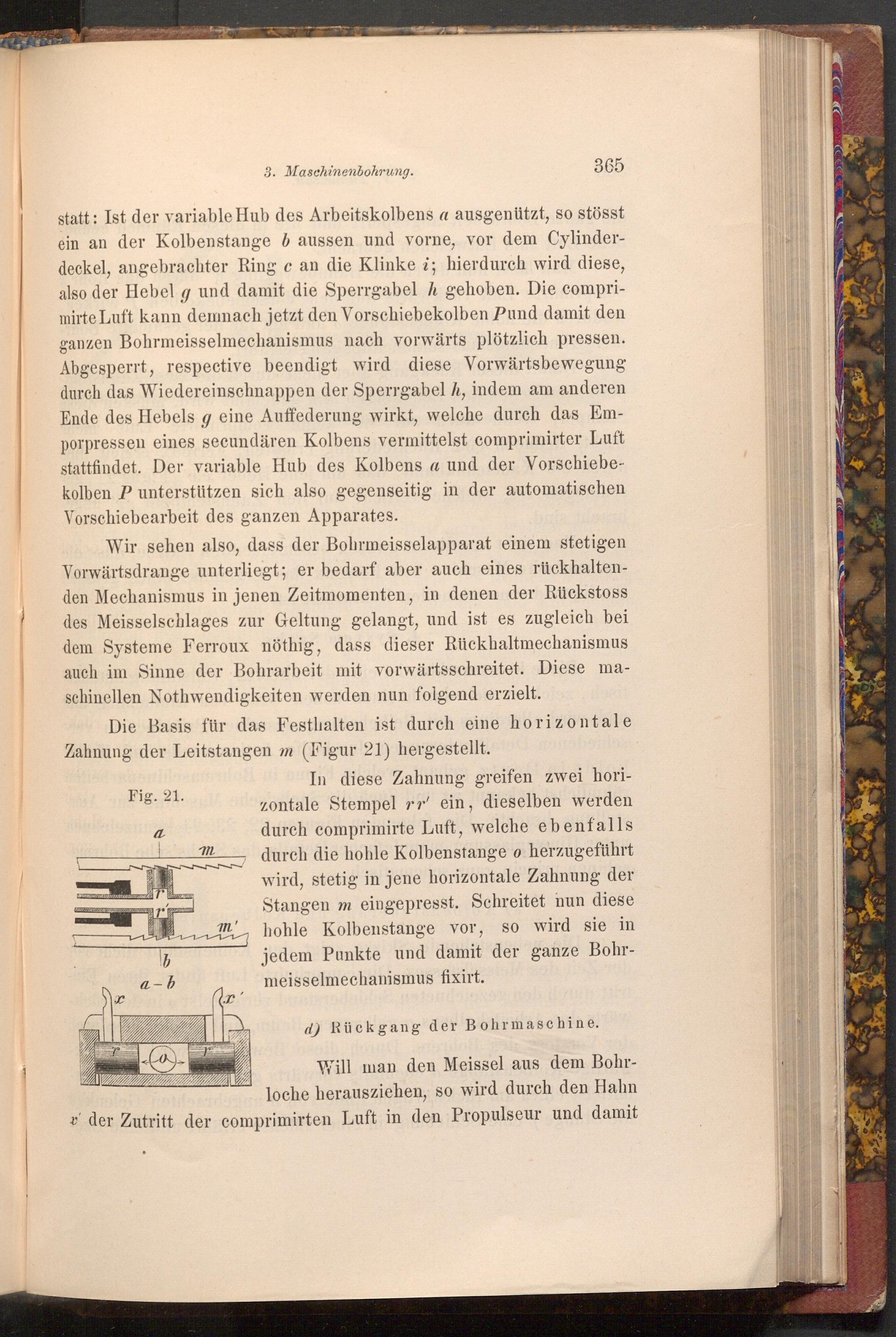 In diese Zahnung greifen zwei horizontale Stempel rr' ein, dieselben werden durch comprimirte Luft, welche ebenfalls durch die hohle Kolbenstange o herzugeführt wird, stetig in jene horizontale Zahnung der Stangen m eingepresst. Schreitet nun diese hohle Kolbenstange vor, so wird sie in jedem Punkte und damit der ganze Bohrmeisselmechanismus fixirt.