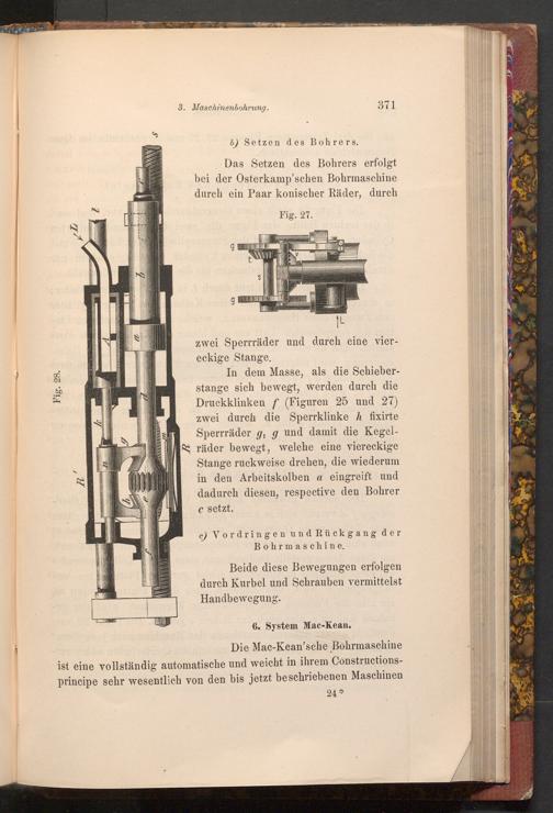 In dem Masse, als die Schieberstange sich bewegt, werden durch die Druckklinken f( Figuren 25 und 27) zwei durch die Sperrklinke h fixirte Sperrräder g₁ g und damit die Kegelräder bewegt, welche eine viereckige Stange ruckweise drehen, die wiederum in den Arbeitskolben a eingreift und dadurch diesen, respective den Bohrer c setzt.