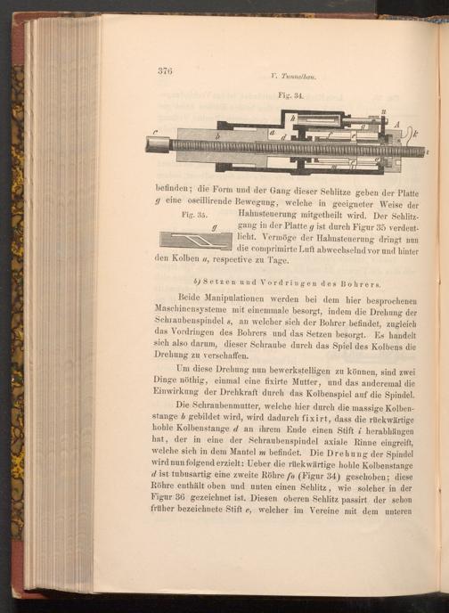 Beide Manipulationen werden bei dem hier besprochenen Maschinensysteme mit einemmale besorgt, indem die Drehung der Schraubenspindel s, an welcher sich der Bohrer befindet, zugleich das Vordringen des Bohrers und das Setzen besorgt. Es handelt. sich also darum, dieser Schraube durch das Spiel des Kolbens die Drehung zu verschaffen.