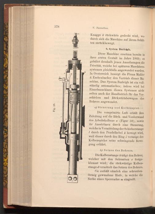 Diese Maschine erschien bereits in ihrer ersten Gestalt im Jahre 1869; es gebührt desshalb jenen Anordnungen die Priorität, welche bei späteren Maschinensystemen gleichfalls angewendet wurden. In Oesterreich besorgt die Firma Mahler & Eschenbacher den Vertrieb dieser Maschine. Das System Burleigh ist ein vollständig automatisches; indess wird bei Einzelmaschinen dieses Systemes nicht selten auch der Handbetrieb für das Vorschieben und Rückwärtsbewegen des Bohrers angewendet.