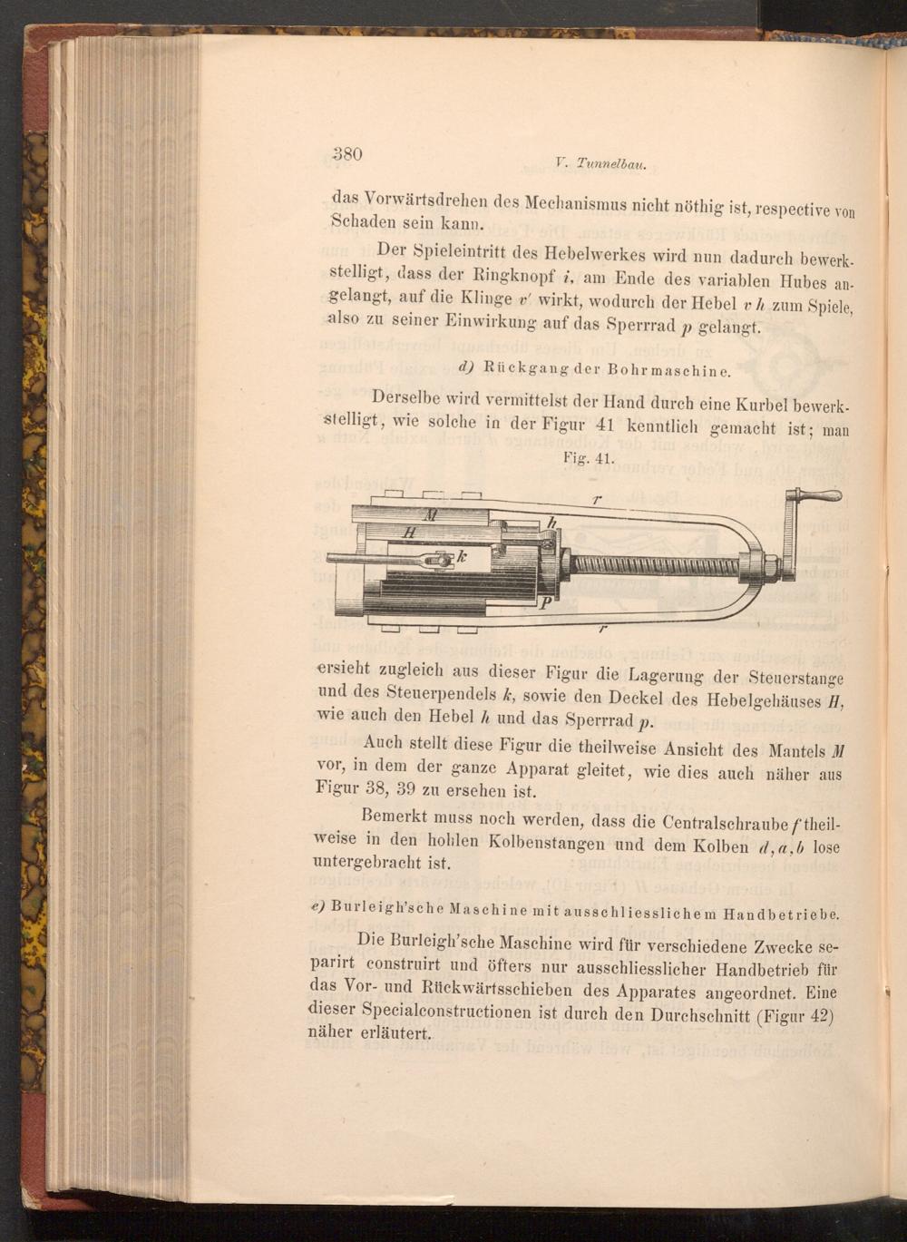 e) Burleigh'sche Maschine mit ausschliesslichem Handbetriebe. Die Burleigh'sche Maschine wird für verschiedene Zwecke separirt construirt und öfters nur ausschliesslicher Handbetrieb für das Vor- und Rückwärtsschieben des Apparates angeordnet. Eine dieser Specialconstructionen ist durch den Durchschnitt( Figur 42) näher erläutert.