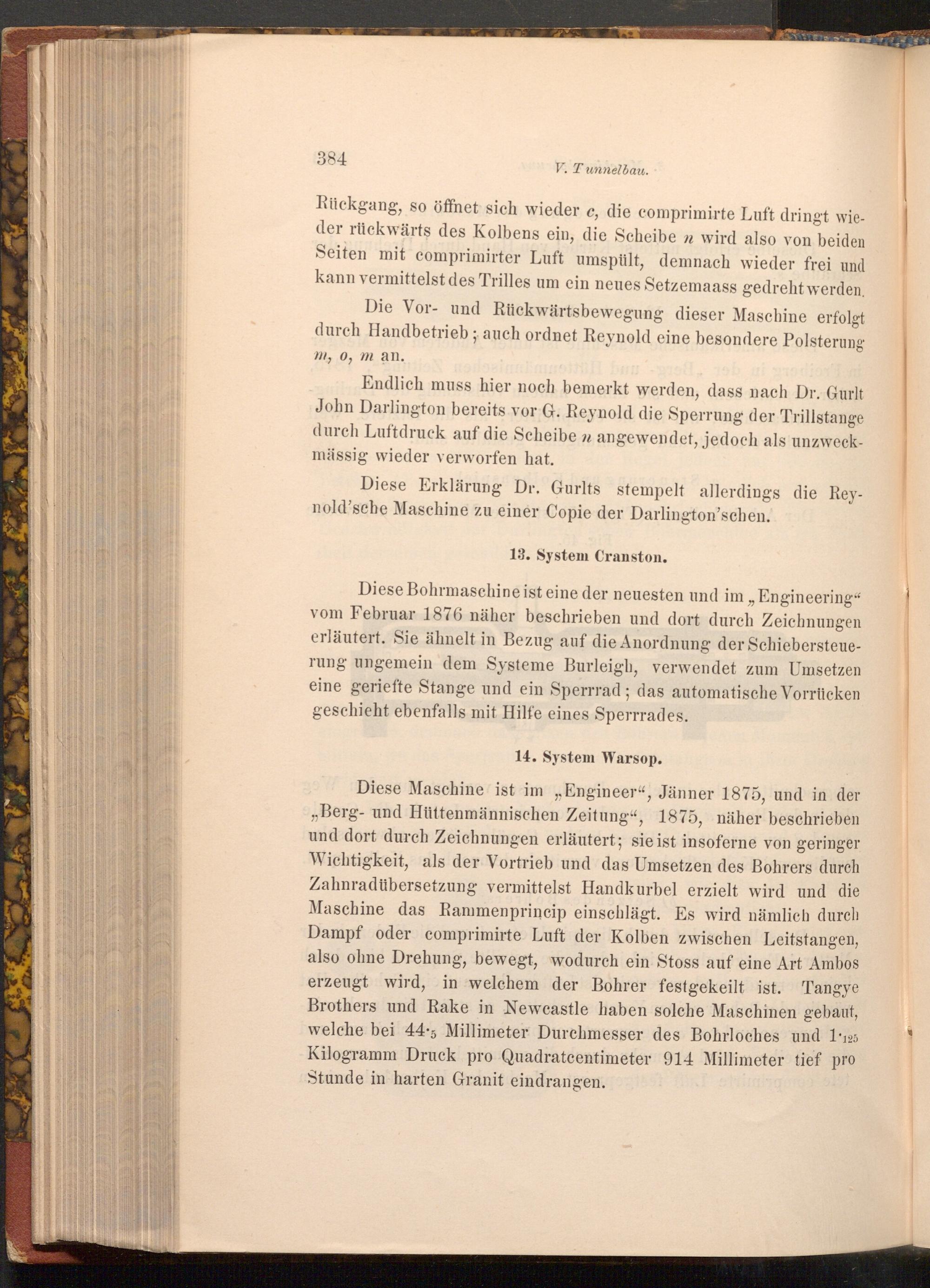 Diese Maschine ist im„, Engineer", Jänner 1875, und in der „ Berg- und Hüttenmännischen Zeitung", 1875, näher beschrieben und dort durch Zeichnungen erläutert; sie ist insoferne von geringer Wichtigkeit, als der Vortrieb und das Umsetzen des Bohrers durch Zahnradübersetzung vermittelst Handkurbel erzielt wird und die Maschine das Rammenprincip einschlägt. Es wird nämlich durch Dampf oder comprimirte Luft der Kolben zwischen Leitstangen, also ohne Drehung, bewegt, wodurch ein Stoss auf eine Art Ambos erzeugt wird, in welchem der Bohrer festgekeilt ist. Tangye Brothers und Rake in Newcastle haben solche Maschinen gebaut, welche bei 44.5 Millimeter Durchmesser des Bohrloches und 1* 125 Kilogramm Druck pro Quadratcentimeter 914 Millimeter tief pro Stunde in harten Granit eindrangen.
