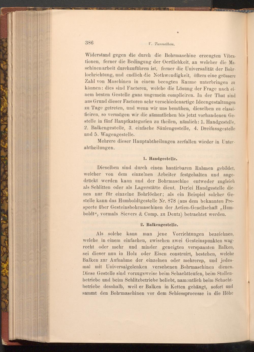 Dieselben sind durch einen hantirbaren Rahmen gebildet, welcher von dem einzelnen Arbeiter festgehalten und angedrückt werden kann und der Bohrmaschine entweder zugleich als Schlitten oder als Lagerstätte dient. Derlei Handgestelle dienen nur für einzelne Bohrlöcher; als ein Beispiel solcher Gestelle kann das Humboldtgestelle Nr. 878( aus dem bekannten Prospecte über Gesteinsbohrmaschinen der Actien- Gesellschaft ,, Humboldt", vormals Sievers& Comp. zu Deutz) betrachtet werden. 2. Balkengestelle.