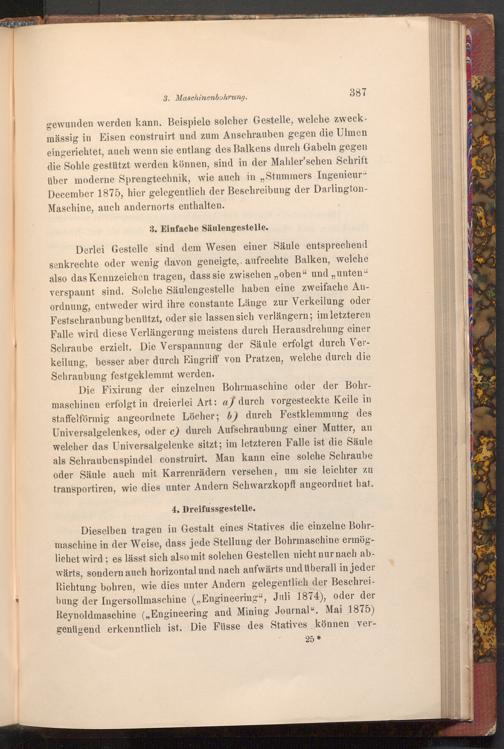 gewunden werden kann. Beispiele solcher Gestelle, welche zweckmässig in Eisen construirt und zum Anschrauben gegen die Ulmen eingerichtet, auch wenn sie entlang des Balkens durch Gabeln gegen die Sohle gestützt werden können, sind in der Mahler'schen Schrift über moderne Sprengtechnik, wie auch in ,, Stummers Ingenieur" December 1875, hier gelegentlich der Beschreibung der DarlingtonMaschine, auch andernorts enthalten.