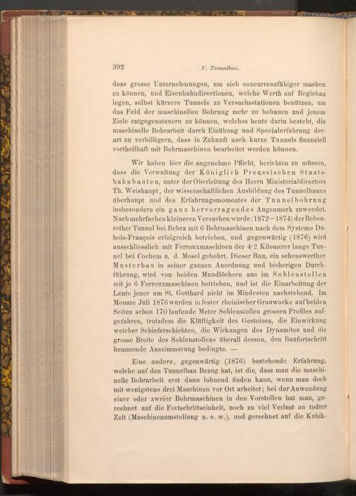 Wir haben hier die angenehme Pflicht, berichten zu müssen, dass die Verwaltung der Königlich Preussischen Staatsbahnbauten, unter der Oberleitung des Herrn Ministerial directors Th. Weishaupt, der wissenschaftlichen Ausbildung des Tunnelbaues überhaupt und des Erfahrungsmomentes der Tunnelbohrung insbesondere ein ganz hervorragendes Augenmerk zuwendet. Nach mehrfachen kleineren Versuchen wurde( 1872-1874) der Bebenrother Tunnel bei Bebra mit 6 Bohrmaschinen nach dem Systeme Dubois- François erfolgreich betrieben, und gegenwärtig( 1876) wird ausschliesslich mit Ferrouxmaschinen der 4.2 Kilometer lange Tunnel bei Cochem a. d. Mosel gebohrt. Dieser Bau, ein sehenswerther Musterbau in seiner ganzen Anordnung und bisherigen Durchführung, wird von beiden Mundlöchern aus im Sohlenstollen mit je 6 Ferrouxmaschinen betrieben, und ist die Einarbeitung der Leute jener am St. Gotthard nicht im Mindesten nachstehend. Im Monate Juli 1876 wurden in fester rheinischer Grauwacke auf beiden Seiten schon 170 laufende Meter Sohlenstollen grossen Profiles aufgefahren, trotzdem die Klüftigkeit des Gesteines, die Einwirkung weicher Schieferschichten, die Wirkungen des Dynamites und die grosse Breite des Sohlenstollens überall dessen, den Baufortschritt hemmende Auszimmerung bedingte.