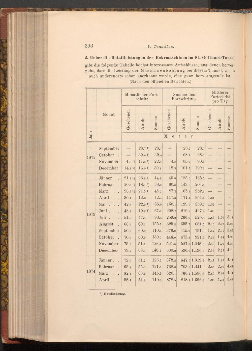 2. Ueber die Detailleistungen der Bohrmaschinen im St. Gotthard- Tunnel gibt die folgende Tabelle höchst interessante Aufschlüsse, aus denen hervorgeht, dass die Leistung der Maschinenbohrung bei diesem Tunnel, wie es auch anderenorts schon anerkannt wurde, eine ganz hervorragende ist. ( Nach den officiellen Berichten.)