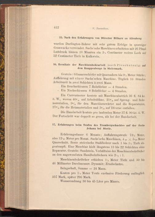 Erfahrungsdauer 6 Monate; Auffahrungsteufe 735 Meter, also 12.25 Meter pro Monat. Sachs'sche Maschinen, 448 X 5.00 Meter Querschnitt. Beste steierische Stahlbohrer nach 1 bis 1.5 Tiefe abgestumpft. Eine Maschine hielt längstens 13 bis 22 Schichten ohne Reparatur. Gestein: Sandstein. Verhältniss der Maschinenbohrlöcher zu den angewendeten Handbohrlöchern wie 271: 1.