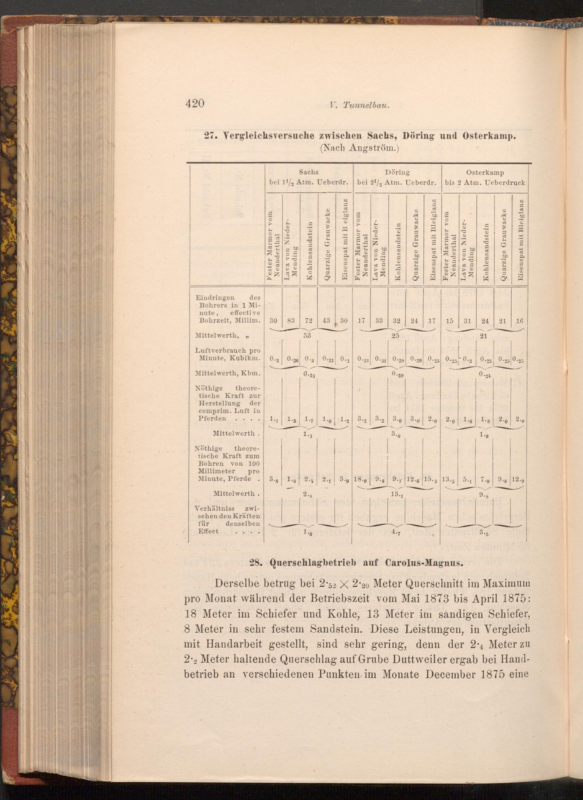 Derselbe betrug bei 2.52 X 2.20 Meter Querschnitt im Maximum pro Monat während der Betriebszeit vom Mai 1873 bis April 1875: 18 Meter im Schiefer und Kohle, 13 Meter im sándigen Schiefer, 8 Meter in sehr festem Sandstein. Diese Leistungen, in Vergleich mit Handarbeit gestellt, sind sehr gering, denn der 24 Meter zu 22 Meter haltende Querschlag auf Grube Duttweiler ergab bei Handbetrieb an verschiedenen Punkten im Monate December 1875 eine