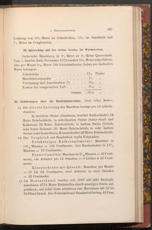 c) Im Hoos actunnel wurden seit 1869 mit acht Burleighmaschinen 4774 Meter Richtstollen durch quarzigen Gneis aufgefahren; auf jeder Seite arbeiteten vier Maschinen mit 50 bis 60 Pfund Druck. Der Fortschritt mit Handarbeit betrug 49 Fuss,