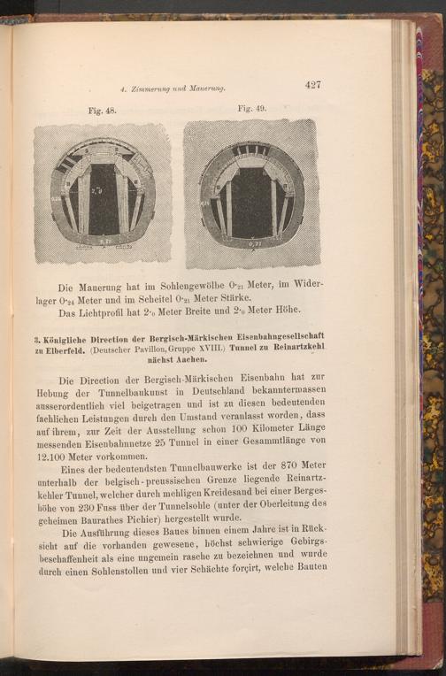 Die Direction der Bergisch- Märkischen Eisenbahn hat zur Hebung der Tunnelbaukunst in Deutschland bekanntermassen ausserordentlich viel beigetragen und ist zu diesen bedeutenden fachlichen Leistungen durch den Umstand veranlasst worden, dass auf ihrem, zur Zeit der Ausstellung schon 100 Kilometer Länge messenden Eisenbahnnetze 25 Tunnel in einer Gesammtlänge von 12.100 Meter vorkommen.