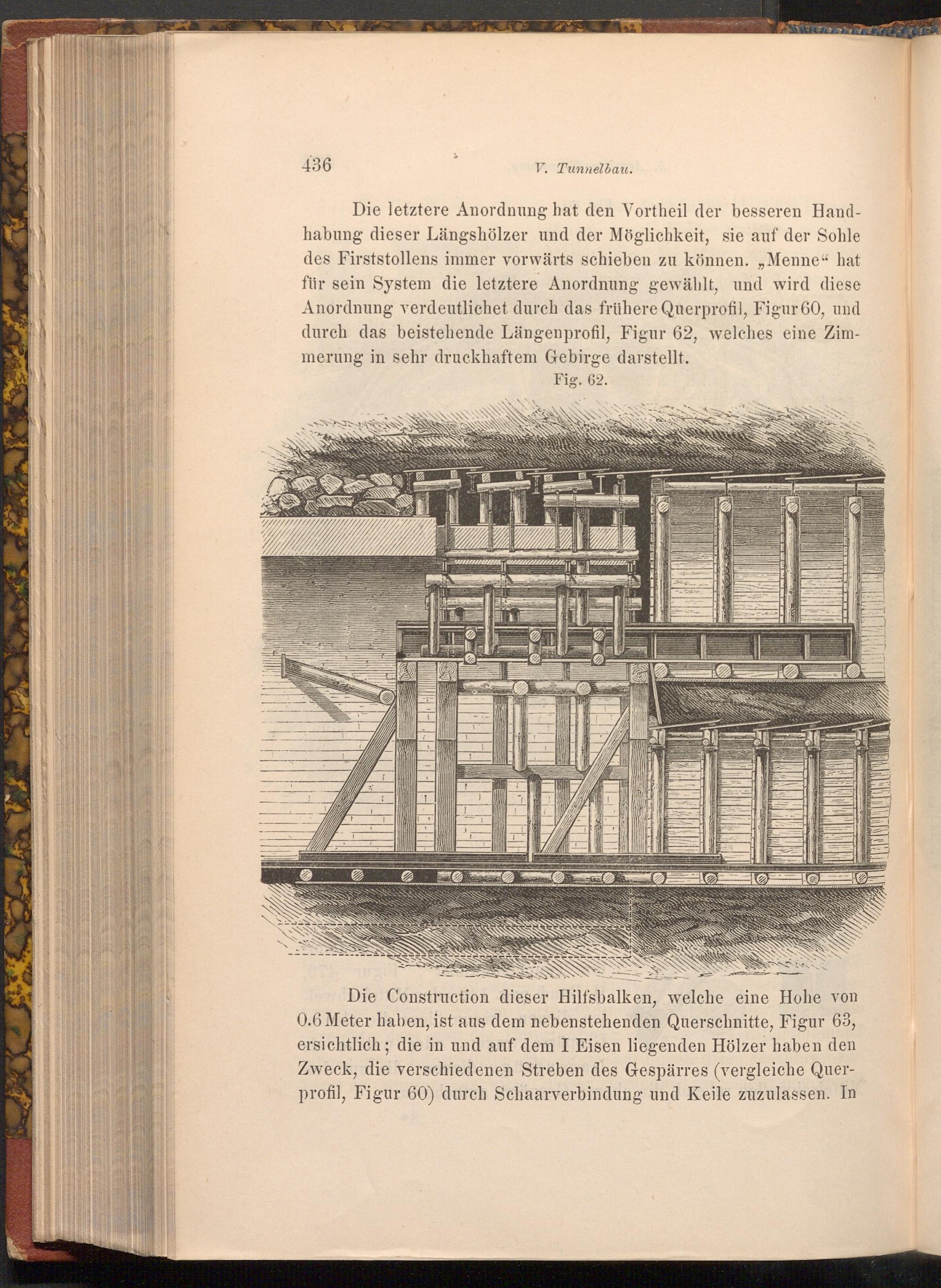 Die letztere Anordnung hat den Vortheil der besseren Handhabung dieser Längshölzer und der Möglichkeit, sie auf der Sohle des Firststollens immer vorwärts schieben zu können.„ Menne" hat für sein System die letztere Anordnung gewählt, und wird diese Anordnung verdeutlichet durch das frühere Querprofil, Figur 60, und durch das beistehende Längenprofil, Figur 62, welches eine Zimmerung in sehr druckhaftem Gebirge darstellt.