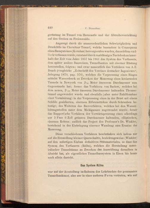 Angeregt durch die ausserordentlichen Schwierigkeiten und Druckfälle im Czernitzer Tunnel, welche besonders in Consequenz eines Bausystemes( Kernbau) hervorgerufen wurden, das seitdem endlich verlassen wurde, entstand durch unablässiges Nachdenken innerhalb der Zeit vom Jahre 1857 bis 1861 das System des Verfassers, dem später andere Bauweisen, Tunnelbauten mit eiserner Rüstung herzustellen, folgten; und zwar namentlich das Verfahren von A. E. Beach( vergleiche Zeitschrift des Vereines deutscher Ingenieure", Jahrgang 1870, pag. 576), welches die Vorpressung eines Ringes mittelst Wasserdruck zu Zwecken der Mauerung eines kreisrunden Tunnels in Newyork von 2.84 Meter äusserem Durchmesser zum Gegenstande hat; ferner das Verfahren von Barlow, welches bei dem neuen, 2.133 Meter äusseren Durchmesser haltenden Themsetunnel angewendet wurde und ebenfalls( aber unter Zuhilfenahme einer Vorminirung) in der Vorpressung eines in der Brust mit einem Schilde gesicherten, eisernen Röhrenstückes durch Schrauben befestigt; des Weiteren das Bauverfahren, welches bei den Wasserleitungsstollen unter dem Michigansee angewendet wurde; ferner das Ruppert'sche Verfahren der Vorwärtspressung eines allerdings nur 3 Fuss 6 Zoll grössten Durchmesser haltenden, elliptischen, eisernen Rohres; endlich das Project des Professor's Dr. Winkler, bestehend in der Einbringung eiserner Wandung zum Ersatze der Mauerung.