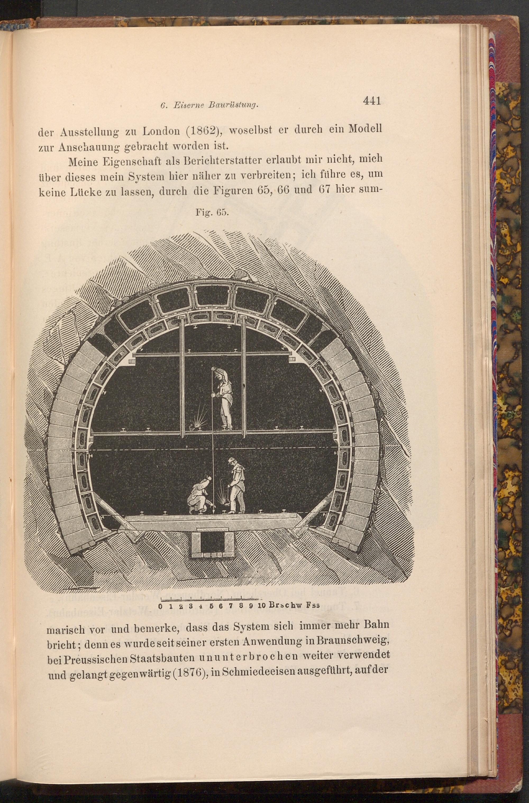 marisch vor und bemerke, dass das System sich immer mehr Bahn bricht; denn es wurde seit seiner ersten Anwendung in Braunschweig, bei Preussischen Staatsbauten ununterbrochen weiter verwendet und gelangt gegenwärtig( 1876), in Schmiedeeisen ausgeführt, auf der