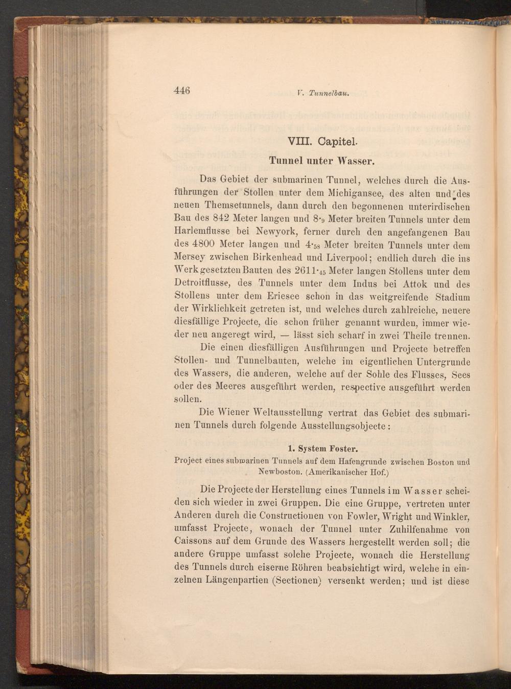 Die Projecte der Herstellung eines Tunnels im Wasser scheiden sich wieder in zwei Gruppen. Die eine Gruppe, vertreten unter Anderen durch die Constructionen von Fowler, Wright und Winkler, umfasst Projecte, wonach der Tunnel unter Zuhilfenahme von Caissons auf dem Grunde des Wassers hergestellt werden soll; die andere Gruppe umfasst solche Projecte, wonach die Herstellung des Tunnels durch eiserne Röhren beabsichtigt wird, welche in einzelnen Längenpartien( Sectionen) versenkt werden; und ist diese