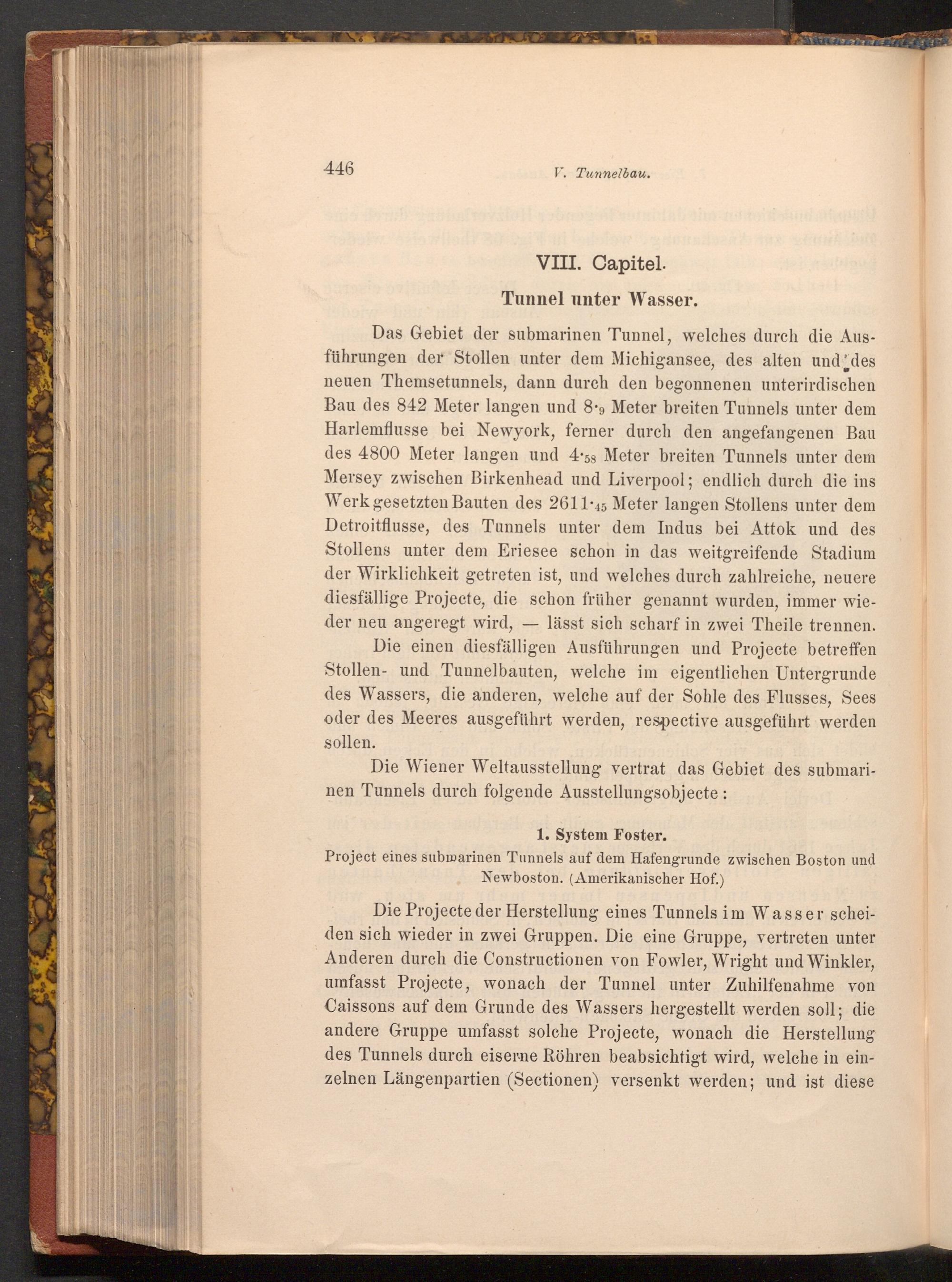 Das Gebiet der submarinen Tunnel, welches durch die Ausführungen der Stollen unter dem Michigansee, des alten und des neuen Themsetunnels, dann durch den begonnenen unterirdischen Bau des 842 Meter langen und 8.9 Meter breiten Tunnels unter dem Harlemflusse bei Newyork, ferner durch den angefangenen Bau des 4800 Meter langen und 4.58 Meter breiten Tunnels unter dem Mersey zwischen Birkenhead und Liverpool; endlich durch die ins Werk gesetzten Bauten des 2611.45 Meter langen Stollens unter dem Detroitflusse, des Tunnels unter dem Indus bei Attok und des Stollens unter dem Eriesee schon in das weitgreifende Stadium der Wirklichkeit getreten ist, und welches durch zahlreiche, neuere diesfällige Projecte, die schon früher genannt wurden, immer wieder neu angeregt wird, lässt sich scharf in zwei Theile trennen. Die einen diesfälligen Ausführungen und Projecte betreffen Stollen- und Tunnelbauten, welche im eigentlichen Untergrunde des Wassers, die anderen, welche auf der Sohle des Flusses, Sees oder des Meeres ausgeführt werden, respective ausgeführt werden sollen.