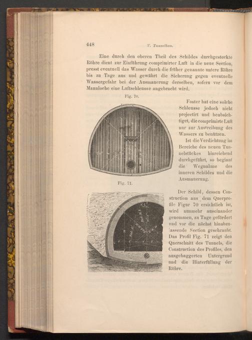Der Schild, dessen Construction aus dem Querprofile Figur 70 ersichtlich ist, wird nunmehr auseinander genommen, zu Tage gefördert und vor die nächst hinabzuJassende Section geschraubt. Das Profil Fig. 71 zeigt den Querschnitt des Tunnels, die Construction des Profiles, den ausgebaggerten Untergrund und die Hinterfüllung der Röhre.