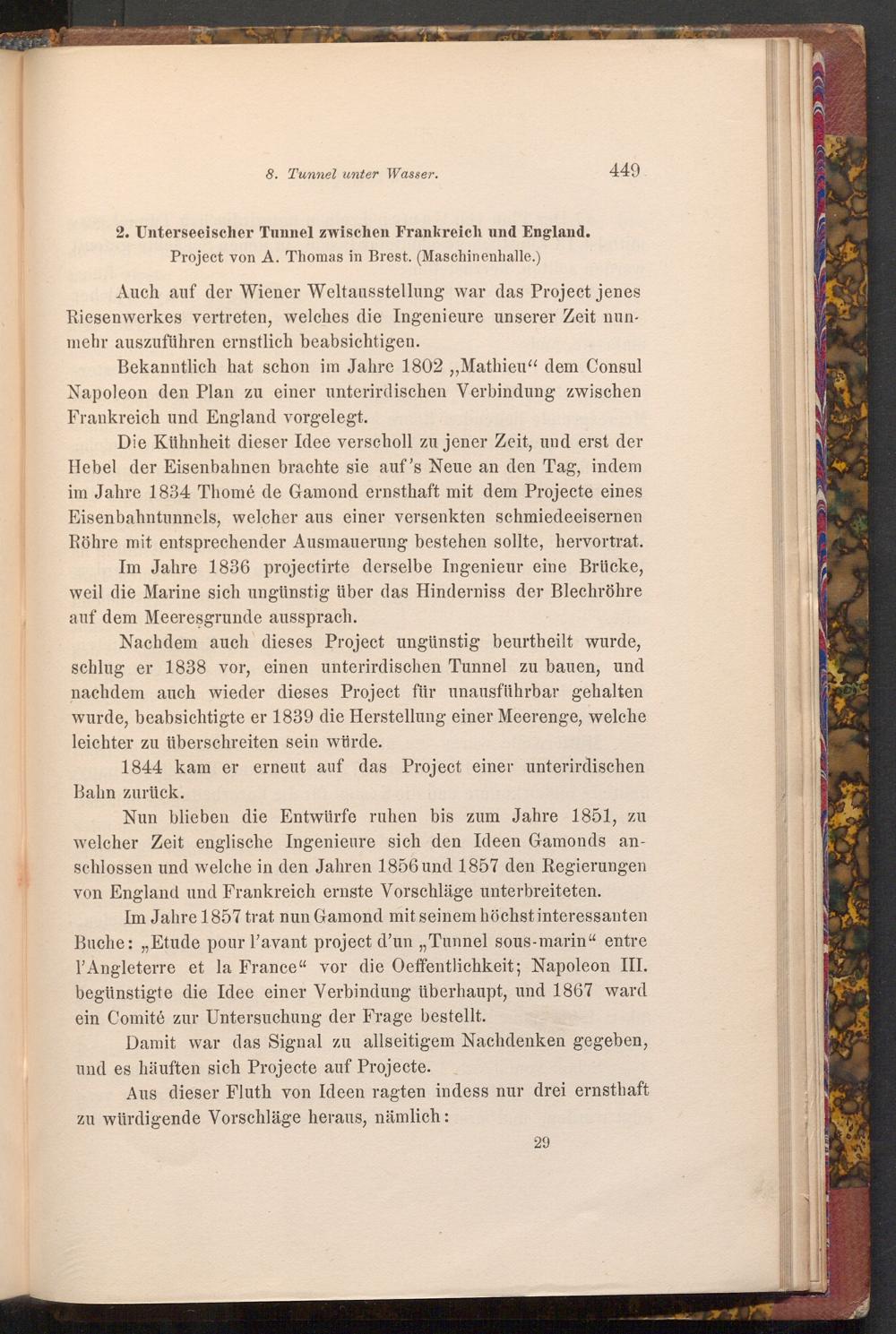 Im Jahre 1857 trat nun Gamond mit seinem höchst interessanten Buche: ,, Etude pour l'avant project d'un ,, Tunnel sous- marin" entre l'Angleterre et la France" vor die Oeffentlichkeit; Napoleon III. begünstigte die Idee einer Verbindung überhaupt, und 1867 ward ein Comité zur Untersuchung der Frage bestellt.