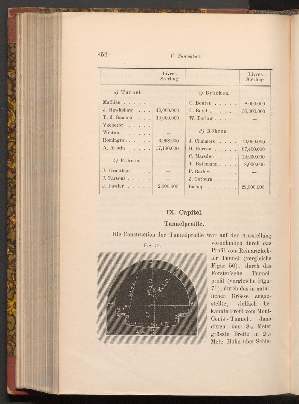 ler Tunnel( vergleiche Figur 50), durch das Forster'sche Tunnelprofil( vergleiche Figur 71), durch das in natürlicher Grösse ausgestellte, vielfach bekannte Profil vom MontCenis- Tunnel, dann durch das 8.0 Meter grösste Breite in 2.72 Meter Höhe über Schie