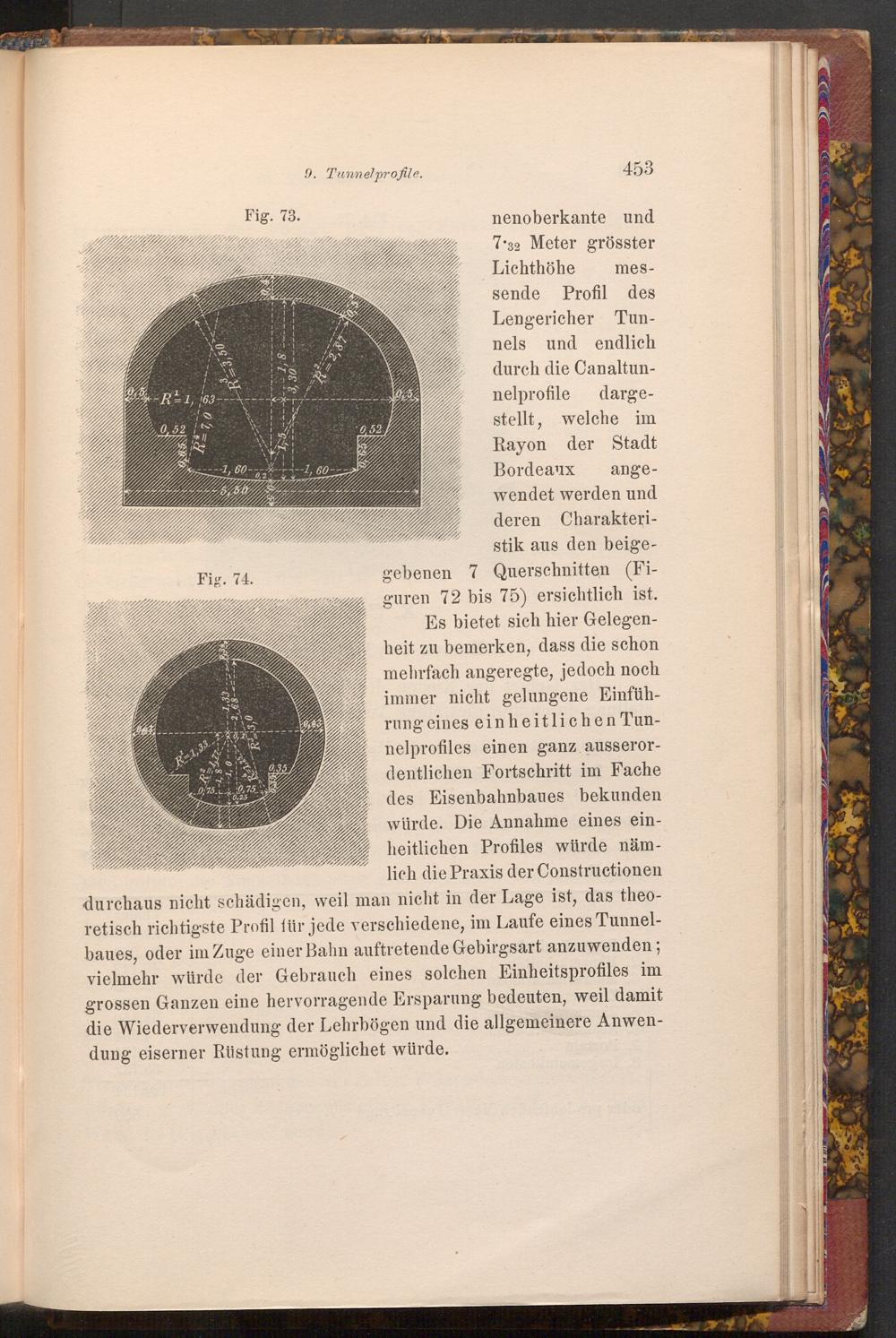 gebenen 7 Querschnitten( Figuren 72 bis 75) ersichtlich ist. Es bietet sich hier Gelegenheit zu bemerken, dass die schon mehrfach angeregte, jedoch noch immer nicht gelungene Einführung eines einheitlichen Tunnelprofiles einen ganz ausserordentlichen Fortschritt im Fache des Eisenbahnbaues bekunden würde. Die Annahme eines einheitlichen Profiles würde nämlich die Praxis der Constructionen