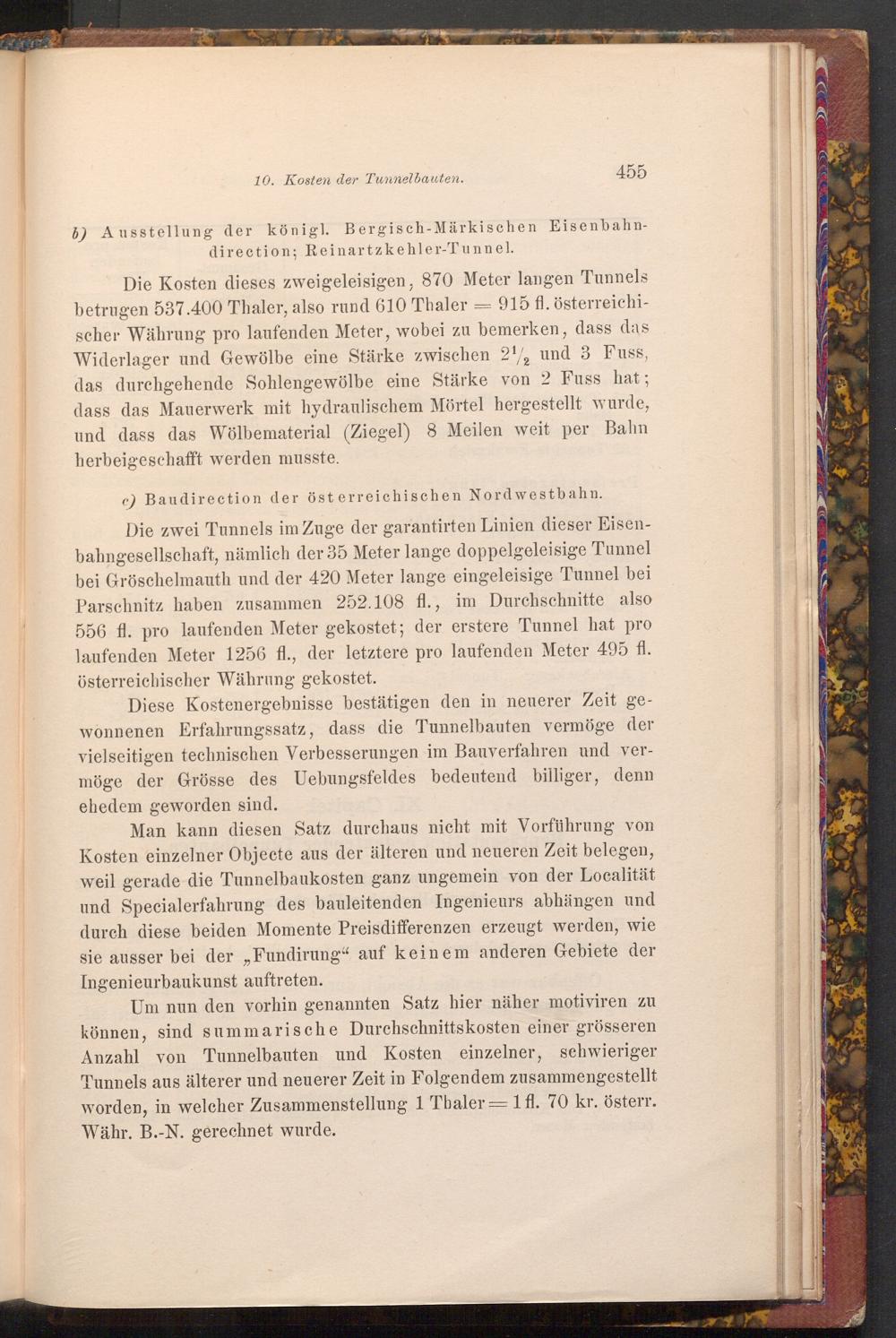 Um nun den vorhin genannten Satz hier näher motiviren zu können, sind summarische Durchschnittskosten einer grösseren Anzahl von Tunnelbauten und Kosten einzelner, schwieriger Tunnels aus älterer und neuerer Zeit in Folgendem zusammengestellt worden, in welcher Zusammenstellung 1 Thaler= 1 fl. 70 kr. österr. Währ. B.-N. gerechnet wurde.