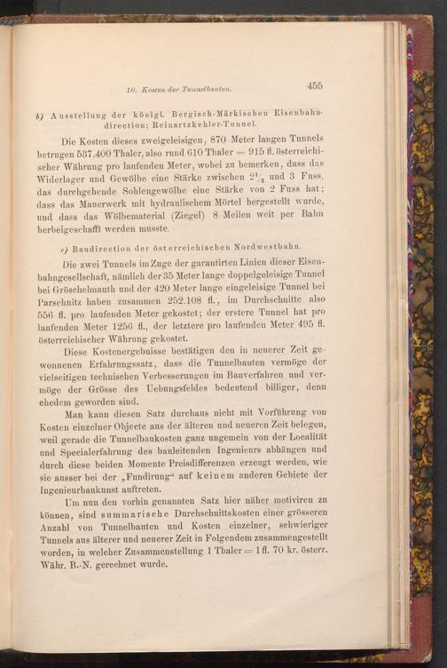 Man kann diesen Satz durchaus nicht mit Vorführung von Kosten einzelner Objecte aus der älteren und neueren Zeit belegen, weil gerade die Tunnelbaukosten ganz ungemein von der Localität und Specialerfahrung des bauleitenden Ingenieurs abhängen und durch diese beiden Momente Preisdifferenzen erzeugt werden, wie sie ausser bei der Fundirung" auf keinem anderen Gebiete der Ingenieurbaukunst auftreten.