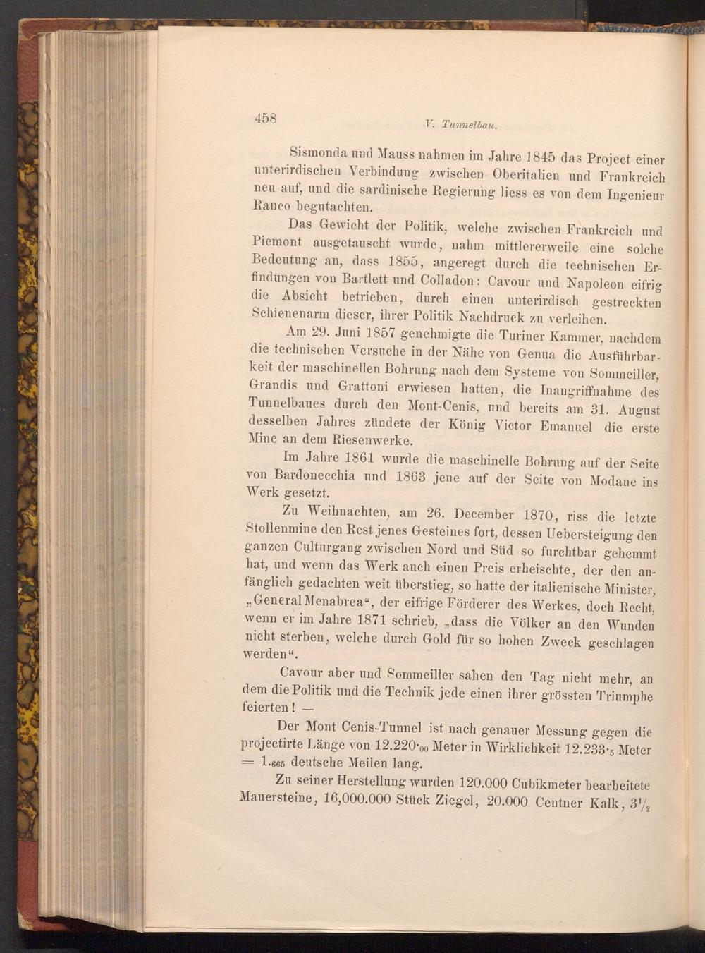 Am 29. Juni 1857 genehmigte die Turiner Kammer, nachdem die technischen Versuche in der Nähe von Genua die Ausführbarkeit der maschinellen Bohrung nach dem Systeme von Sommeiller, Grandis und Grattoni erwiesen hatten, die Inangriffnahme des Tunnelbaues durch den Mont- Cenis, und bereits am 31. August desselben Jahres zündete der König Victor Emanuel die erste Mine an dem Riesenwerke.