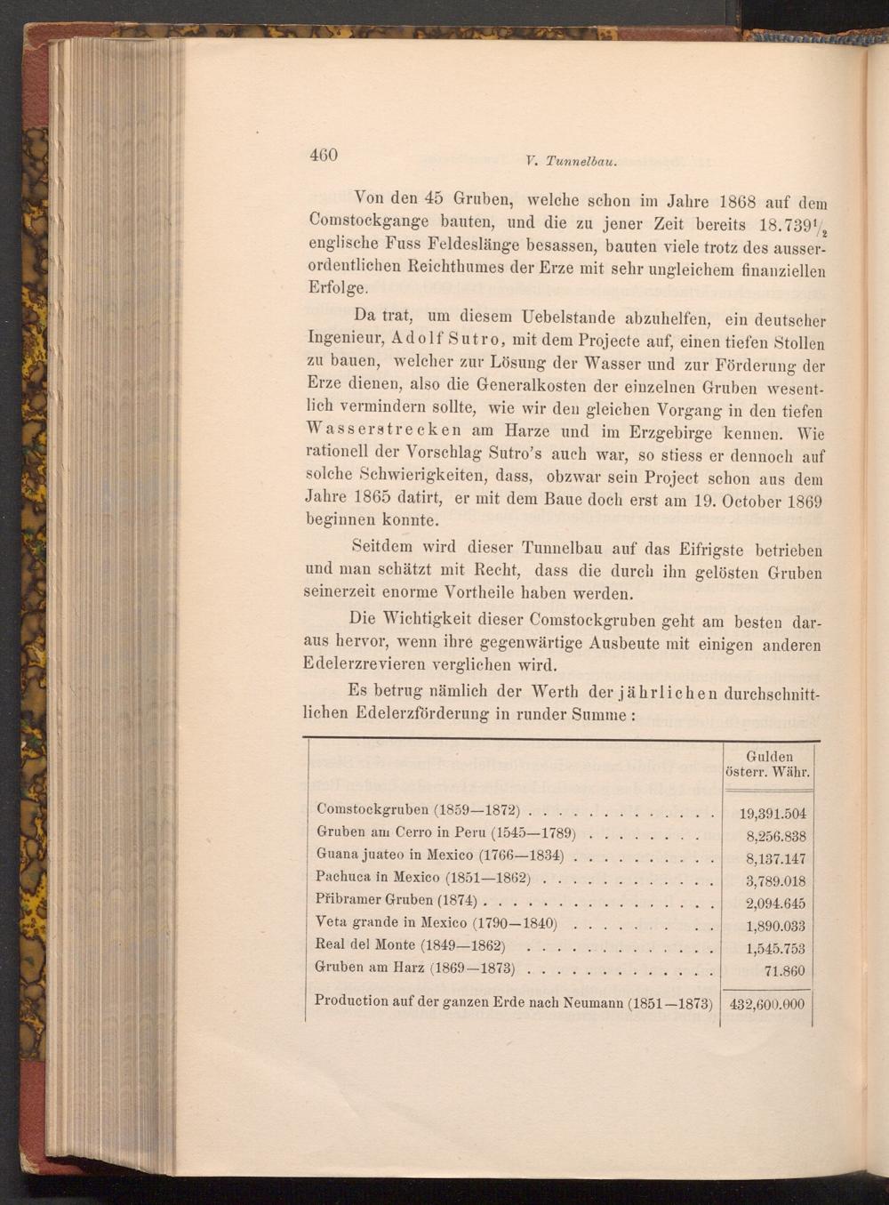 Da trat, um diesem Uebelstande abzuhelfen, ein deutscher Ingenieur, Adolf Sutro, mit dem Projecte auf, einen tiefen Stollen zu bauen, welcher zur Lösung der Wasser und zur Förderung der Erze dienen, also die Generalkosten der einzelnen Gruben wesentlich vermindern sollte, wie wir den gleichen Vorgang in den tiefen Wasserstrecken am Harze und im Erzgebirge kennen. Wie rationell der Vorschlag Sutro's auch war, so stiess er dennoch auf solche Schwierigkeiten, dass, obzwar sein Project schon aus dem Jahre 1865 datirt, er mit dem Baue doch erst am 19. October 1869 beginnen konnte.