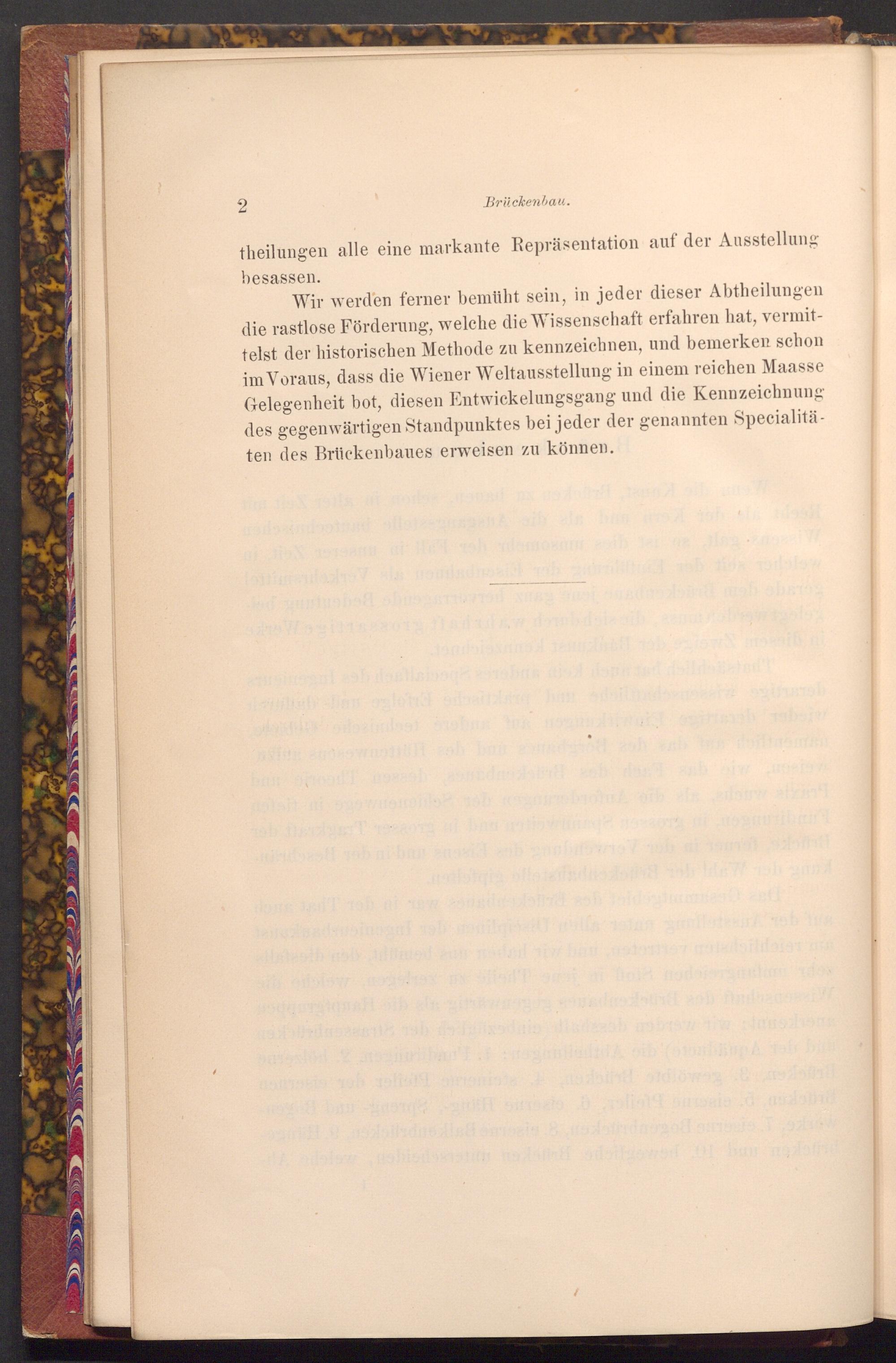 Wir werden ferner bemüht sein, in jeder dieser Abtheilungen die rastlose Förderung, welche die Wissenschaft erfahren hat, vermittelst der historischen Methode zu kennzeichnen, und bemerken schon im Voraus, dass die Wiener Weltausstellung in einem reichen Maasse Gelegenheit bot, diesen Entwickelungsgang und die Kennzeichnung des gegenwärtigen Standpunktes bei jeder der genannten Specialitäten des Brückenbaues erweisen zu können.