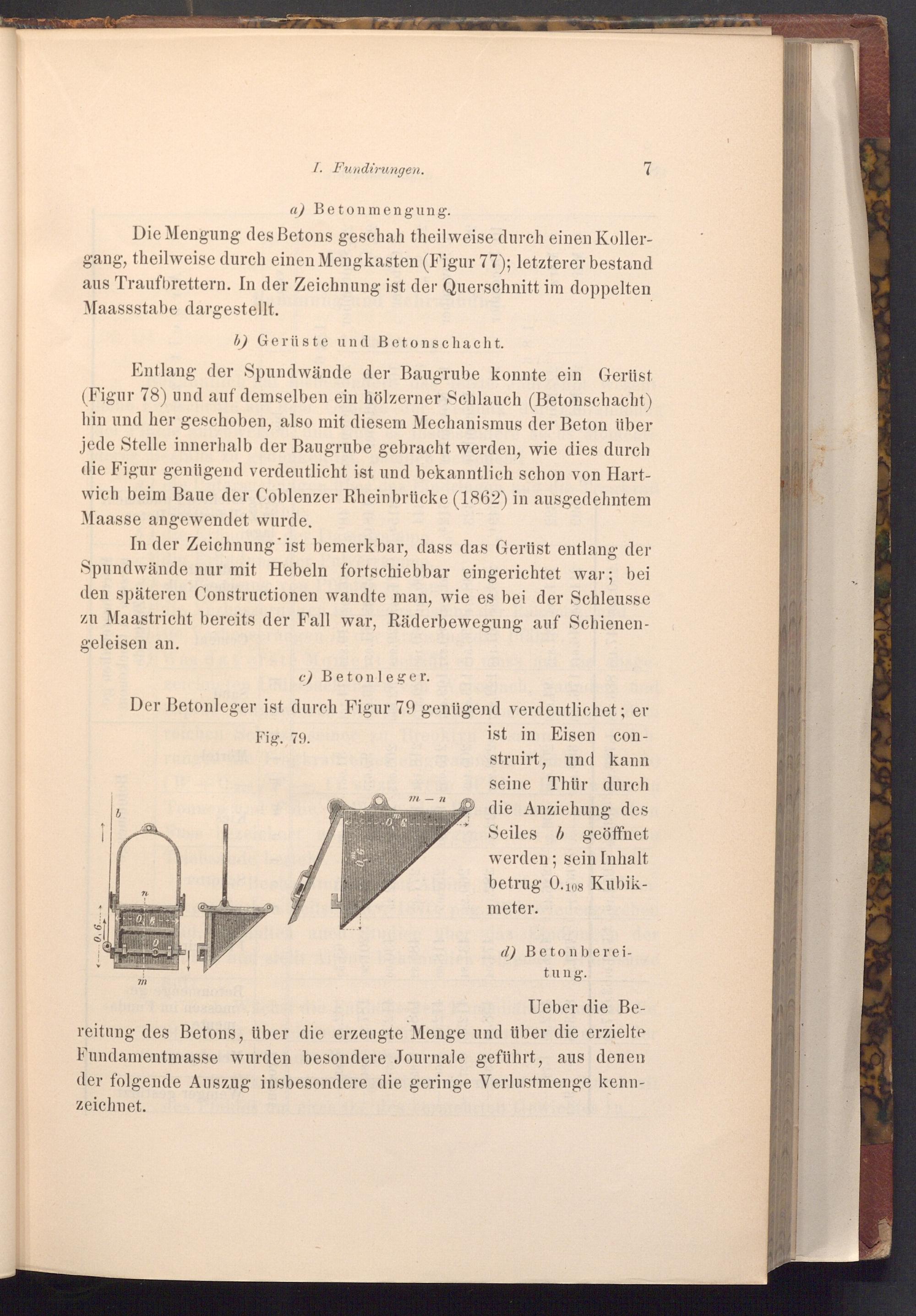 Entlang der Spundwände der Baugrube konnte ein Gerüst ( Figur 78) und auf demselben ein hölzerner Schlauch( Betonschacht) hin und her geschoben, also mit diesem Mechanismus der Beton über jede Stelle innerhalb der Baugrube gebracht werden, wie dies durch die Figur genügend verdeutlicht ist und bekanntlich schon von Hartwich beim Baue der Coblenzer Rheinbrücke( 1862) in ausgedehntem Maasse angewendet wurde.